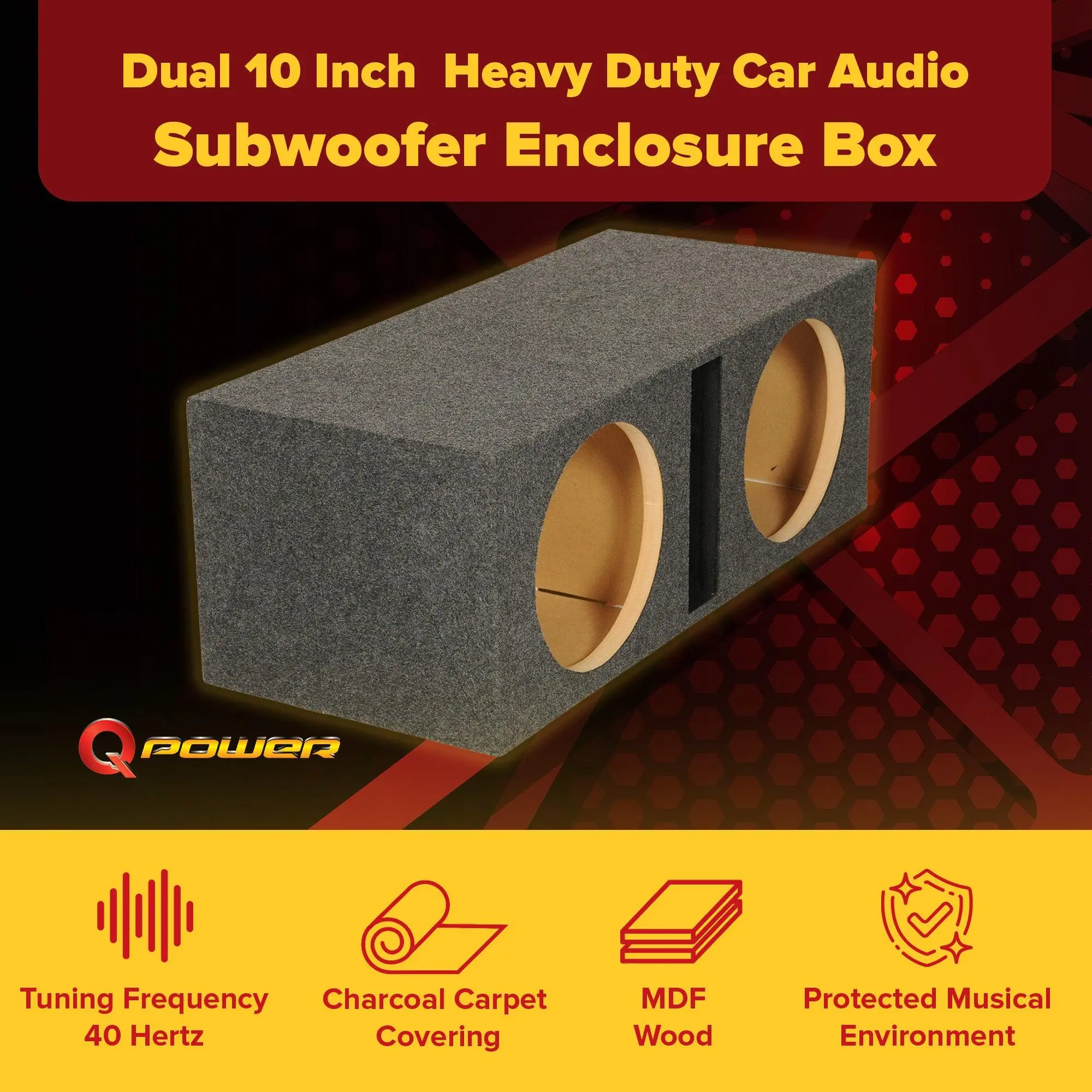 Providing your subwoofers with a quality housing that's sure to impress, the QPower QBASS Dual 10-Inch Subwoofer Box lets you rock the world with loud, pounding bass.Adding extra kick to your vehicle's sound system, the high-quality box installs into your car for quality audio wherever you travel. Displacing 1.1 cubic feet per chamber, the enclosure (2) 10-inch boxes have a total of 2.2 cubic feet produce deep, stereo tones that are sure to impress. Each speaker shares a single slot port vent, helping your woofers manage heat for uninterrupted listening. Made from durable MDF wood material, the boxes withstand the pulsing sound you like and blend into your car's interior with the charcoal carpet finish. Combining with your other audio equipment, your subs are sure to blast away the competition in these boxes.Built to give your vehicle powerful speakers, the QBASS Dual 10-Inch Subwoofer Box by QPower ensures you're the loudest, strongest car on the road.