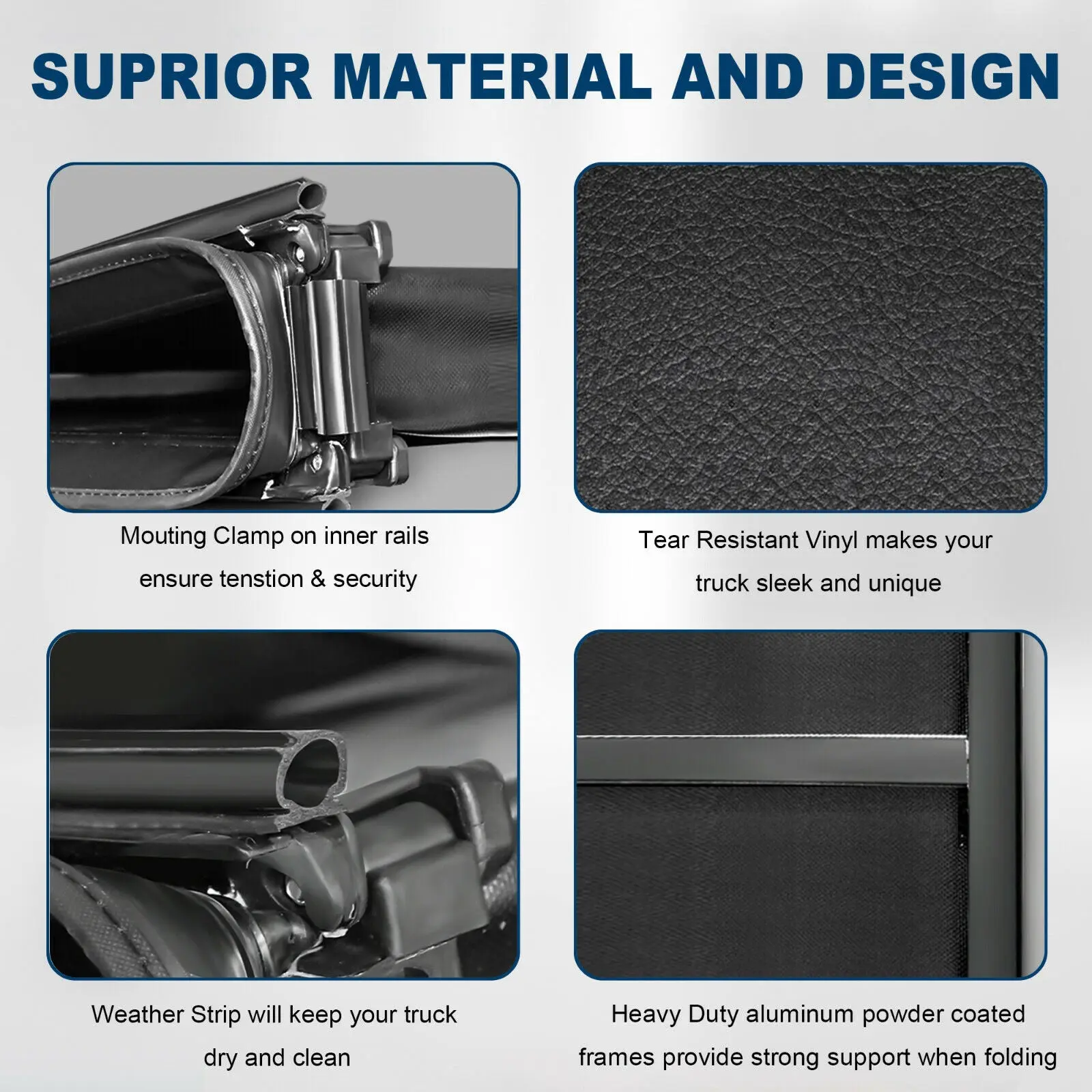 With durable tear-resistant vinyl and rustproof heavy-duty aluminum, the MOSTPLUS Quad-fold soft tonneau cover protects bed items from rain, snow, UV rays, and temperature changes, among other elements. It attaches to your bed with hand-tightened clamps, requiring no tools for installation. Allows 3/4 bed access when folded and removable in minutes. And nylon straps hold the cover in place while open for safe driving.