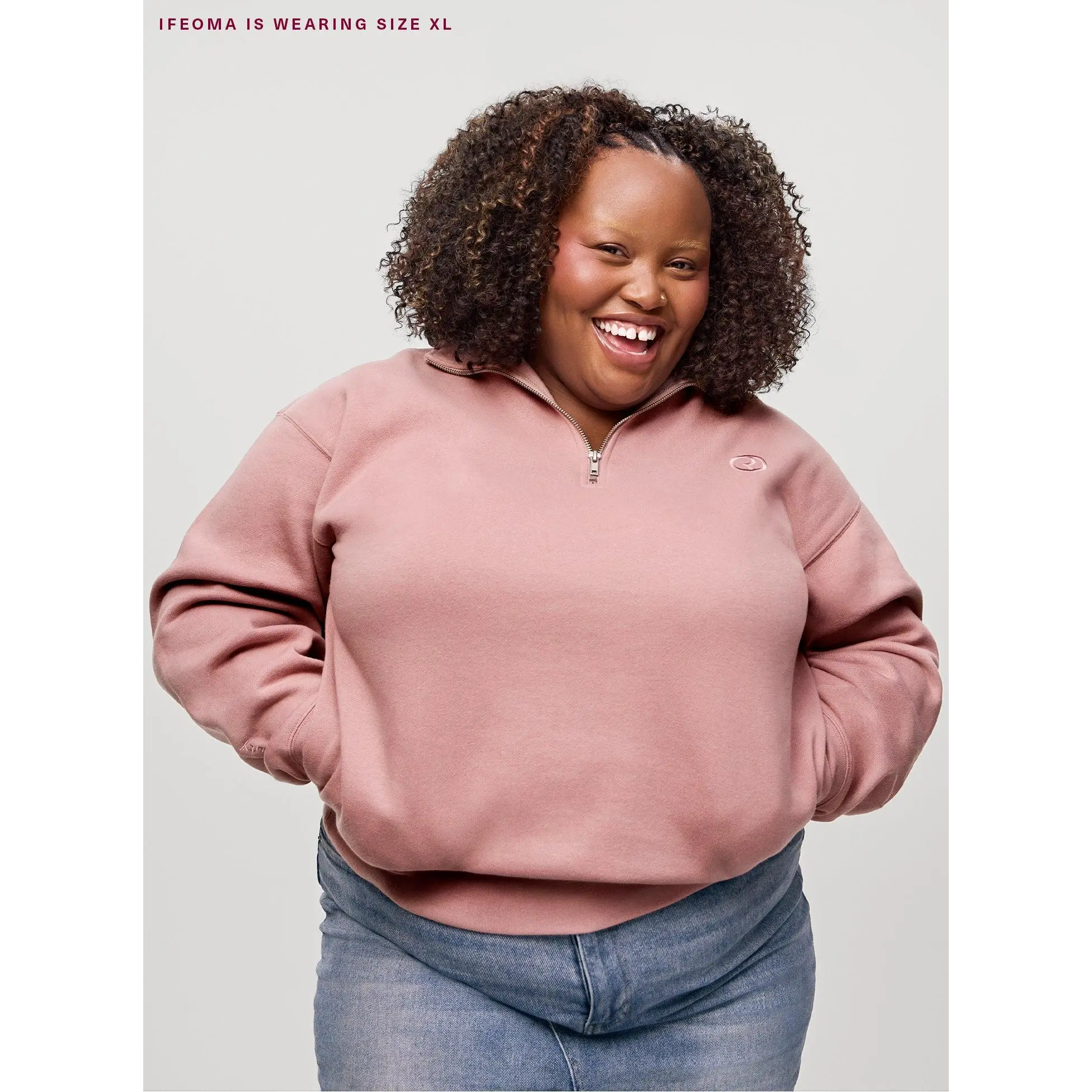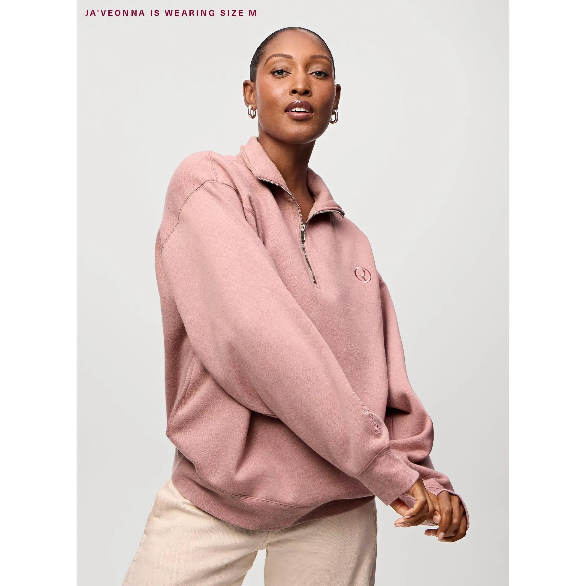 Love this half zip sweatshirt, the fit is oversized I ordered a medium and could have gotten a small. For reference I’m 125 and 5’1”. I like the oversized fit, but I do feel like the small would be oversized on me as well. The color is just as shown, and quality is perfect. It’s not thin.