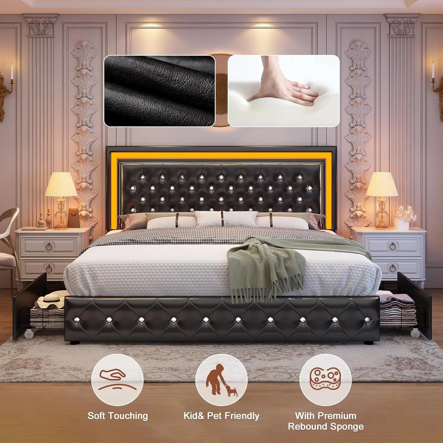 Designed with four spacious smooth-glide drawers under the bed, ideal for organizing clothes, bedding, or daily essentials while keeping your bedroom clean and clutter-free.