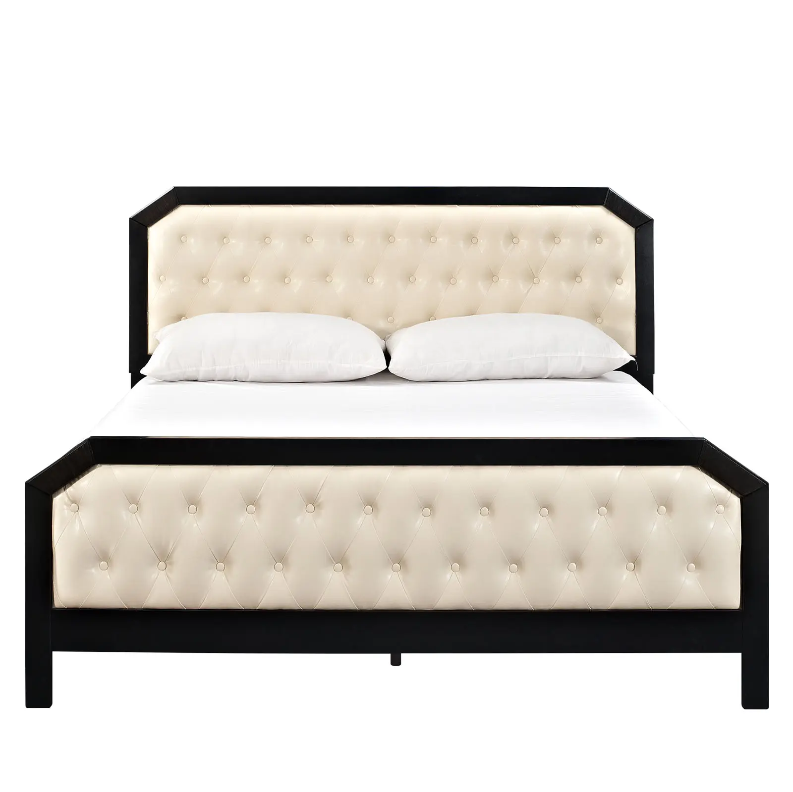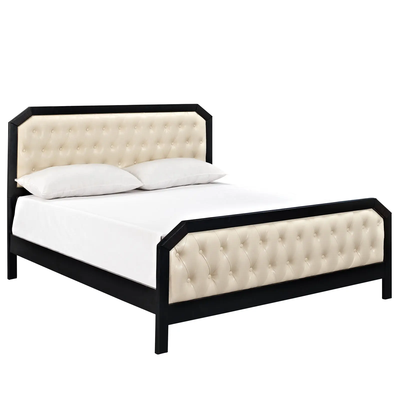 Deep tufted buttons convey a fastidious charm, while the octagonal top presents the possibilities of progress. Delightful to perfection, the Tommy series present the old, while embracing the new, in a simple yet elegant design. Coated in laminated varnish, the charcoal stained borders of the bed, contrast the foam-padded ivory head and footboard. The end result is a coalescing of opposites, amidst an otherwise exacting and stately design. Wipes clean with a moist cloth. The set does not include a mattress or box spring. Includes a queen size frame (also available in a king size version).