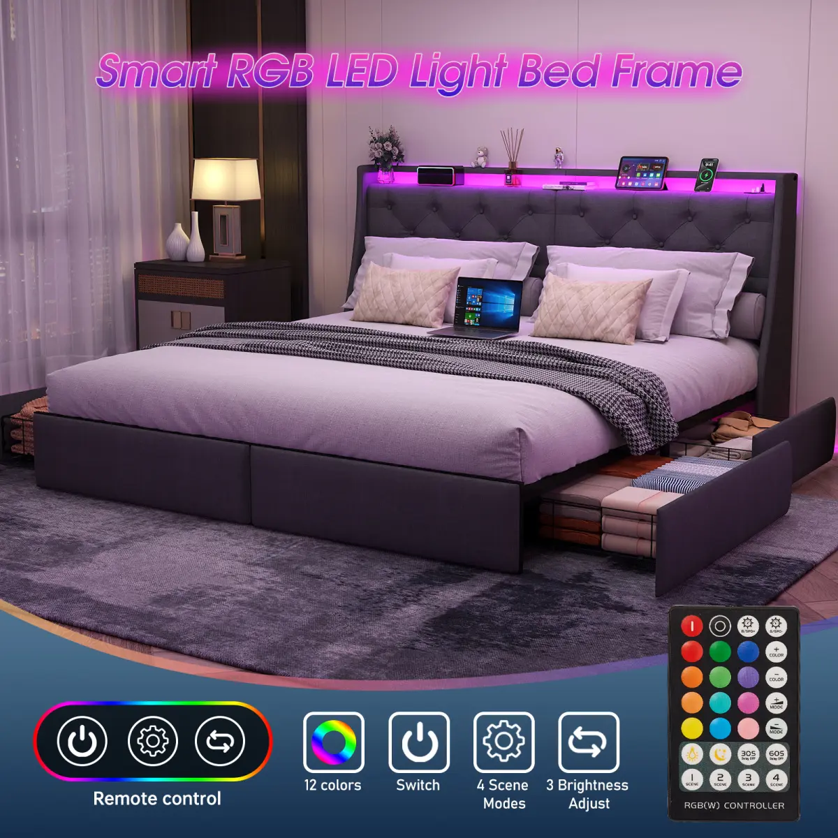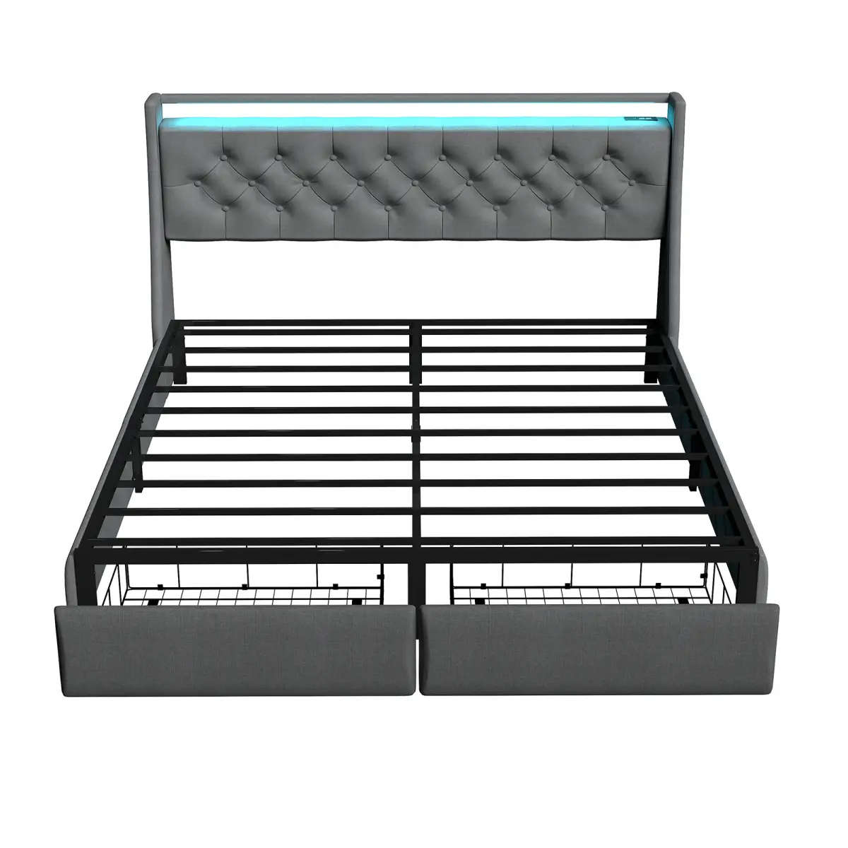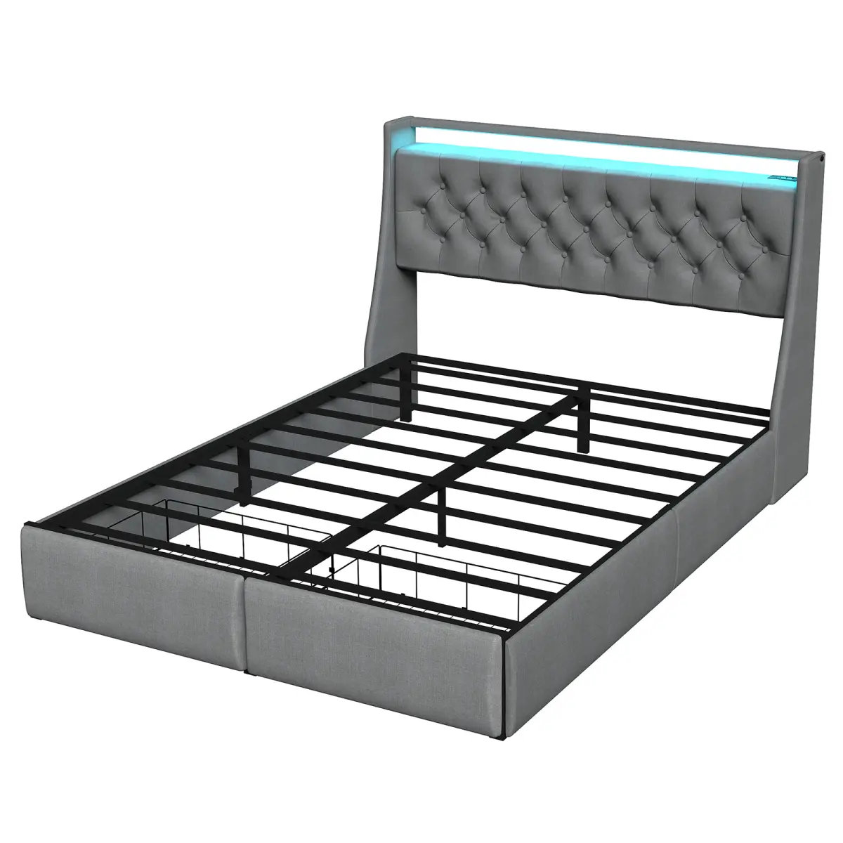 Product Name:Queen Size Bed Frame with Storage Headboard, RGB LED Light & USB Charging Station - Grey