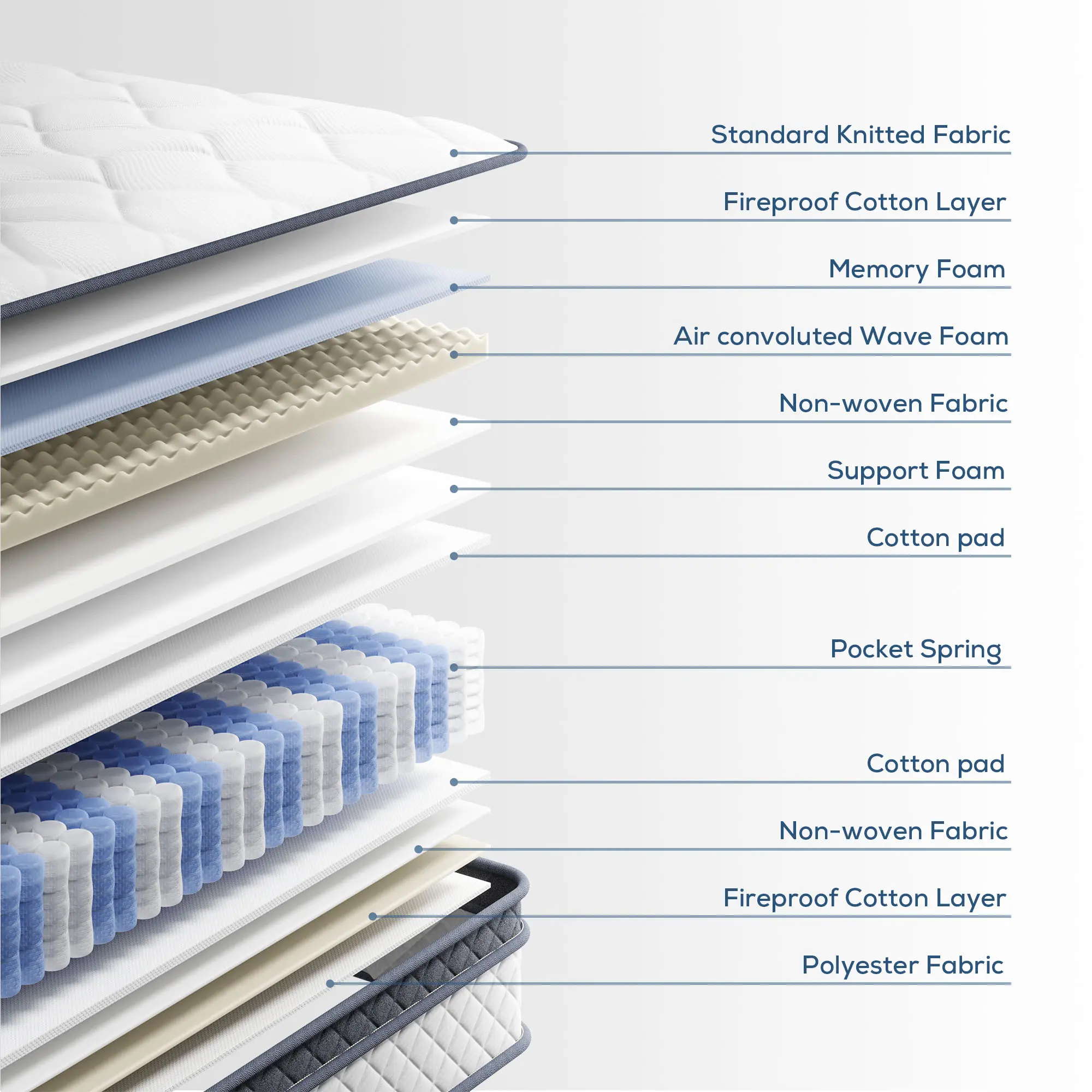 • 15% thicker, high-carbon steel pocketed coils with dual-stage tempered reinforcement. Durable cores in high-density foam ensure comfort and durability. Customized pressure relief for all sleeping positions.