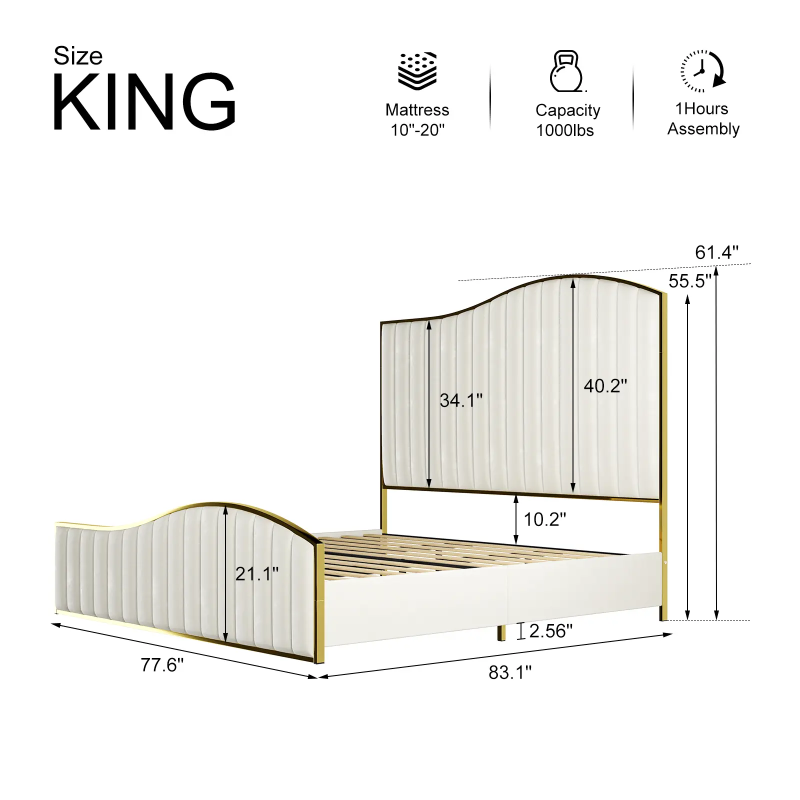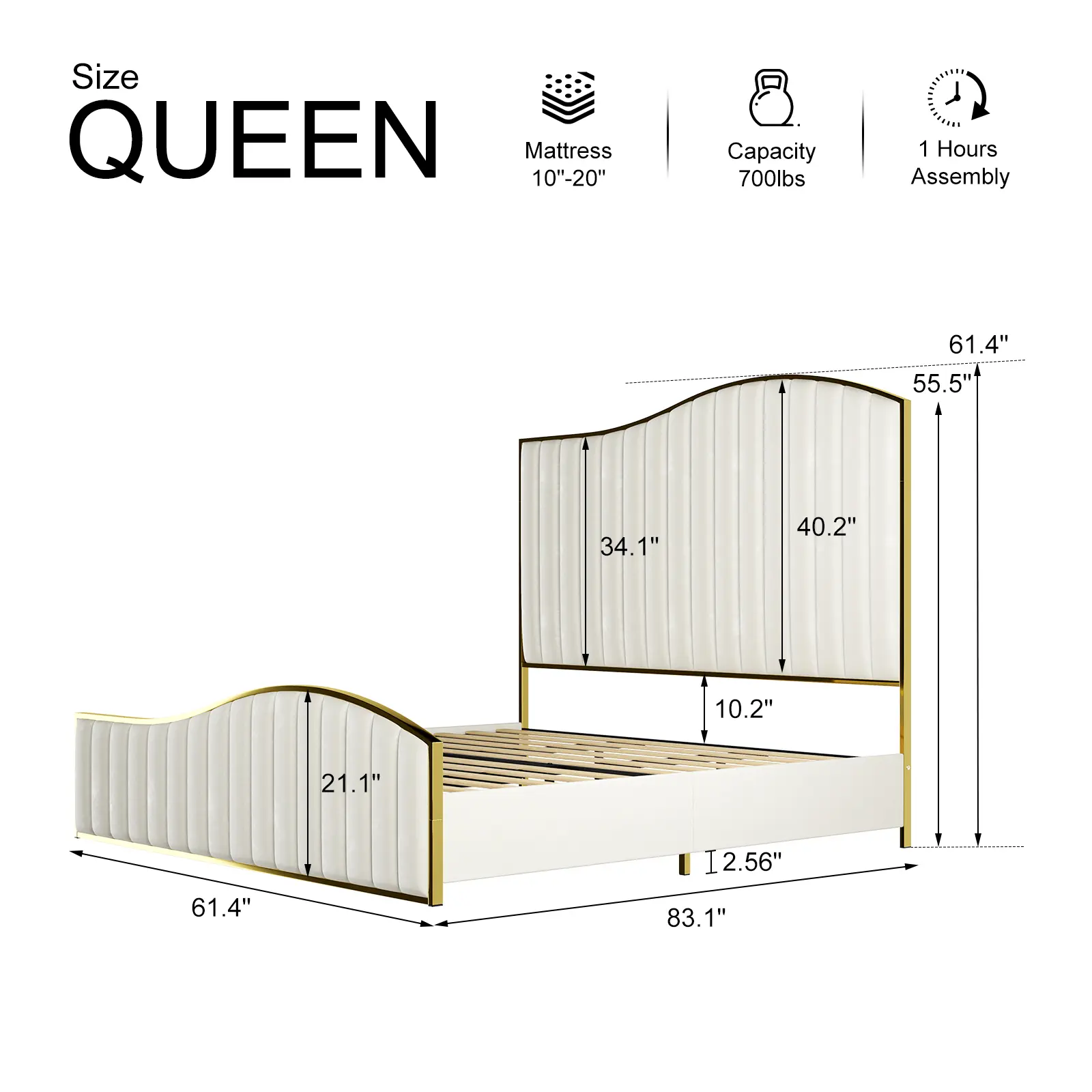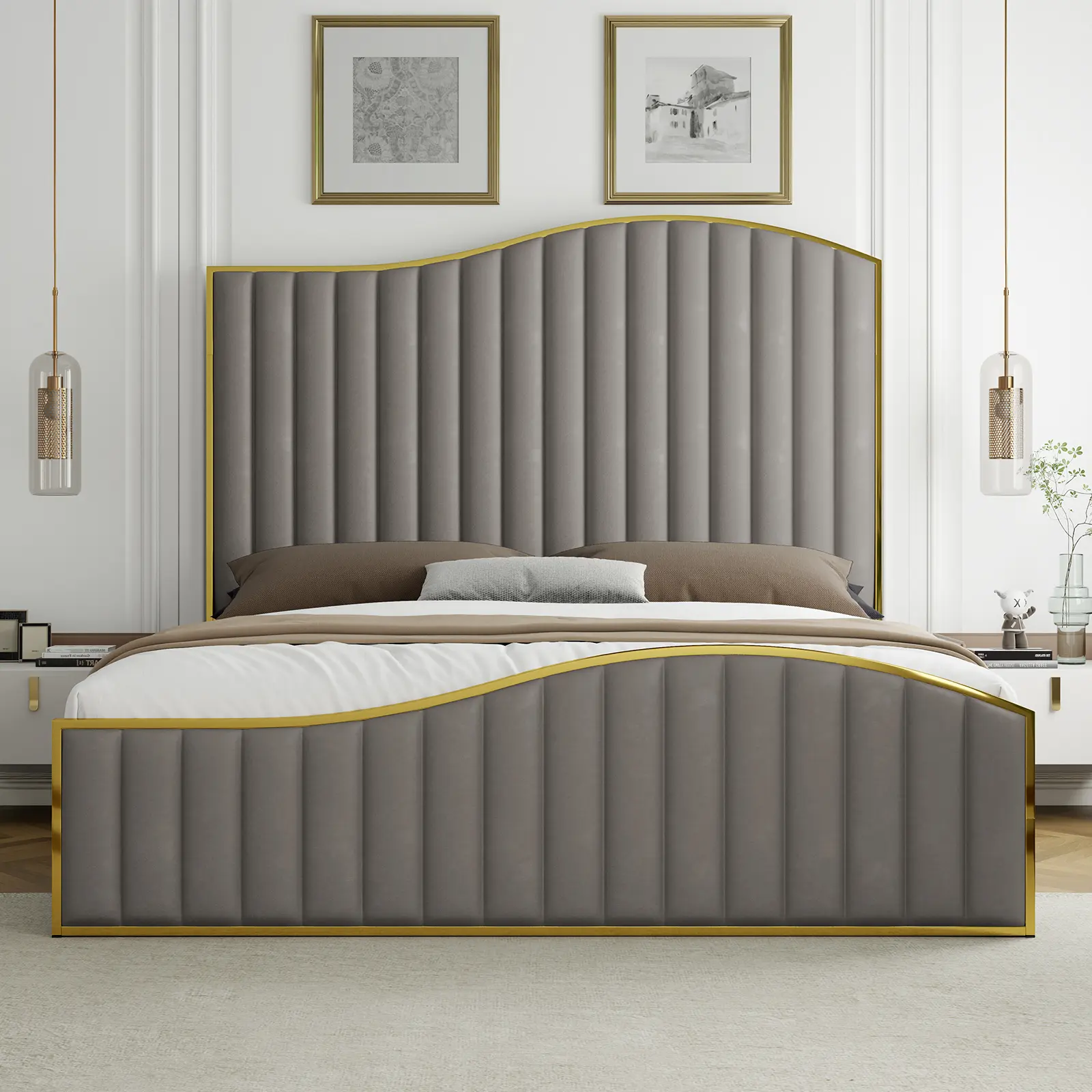 Β·Stylish Design: The bed frame features a 61.4" tall harp headboard and footboard with gold plating trim, adding an elegant touch to your room.