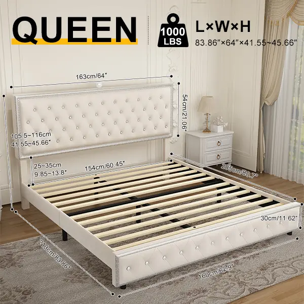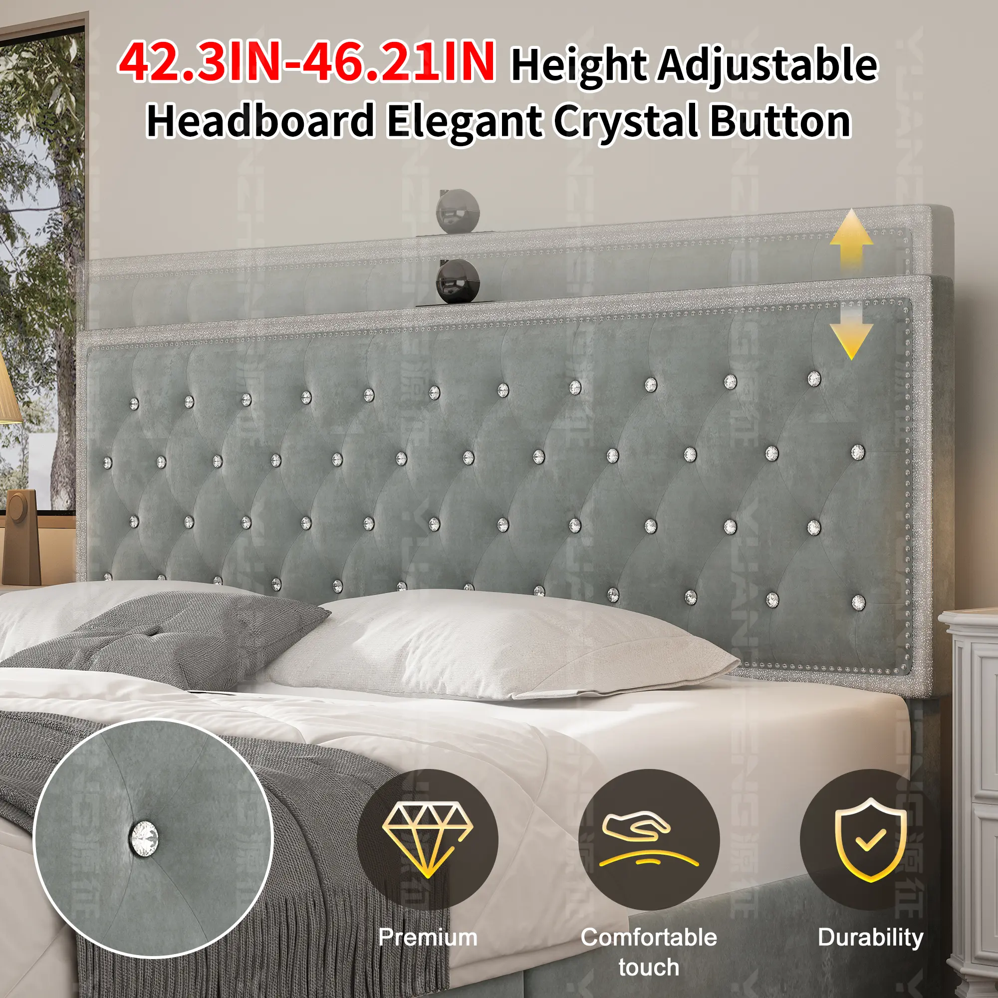 Choose easy-care PU leather with diamond stitching and crystal buttons, or soft velvet fabric for a cozy feel. The 46" headboard height fits mattresses from 8–14 inches.
