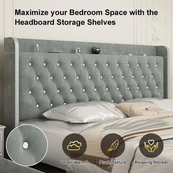 ·Convenient storage solutions: Fabric pockets in the headboard keep essentials close at hand. Spacious foot drawers slide smoothly and feature washable, dust-free lids to keep storage organized and within reach. (Of course, we offer the same bed frame without storage drawers for even better value)