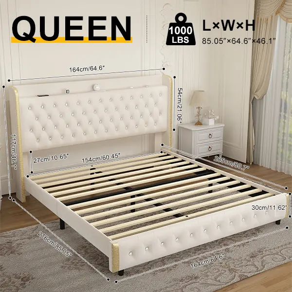 ·Elegant and easy-care PU fabric: Stylish white PU material with diamond stitching and crystal buttons. Soft upholstery for extra comfort and 46-inch headboard height fits all sizes of mattresses. (You can also choose velvet fabric bed frame, he is very soft and comfortable, a little bit of plush to bring a cozy feeling to your home)