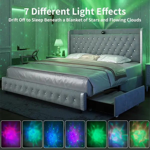 1.This is the introduction of the Starlight bed frame with drawers, he comes with 4 dust drawers. Available in 3 sizes, 2 materials and 4 colors.