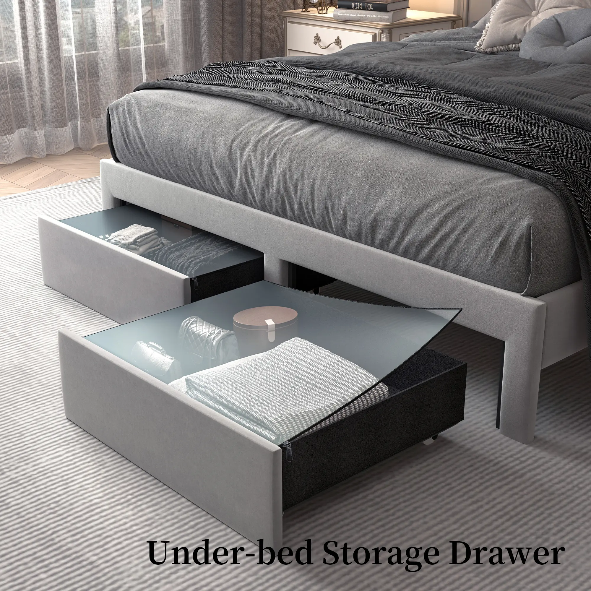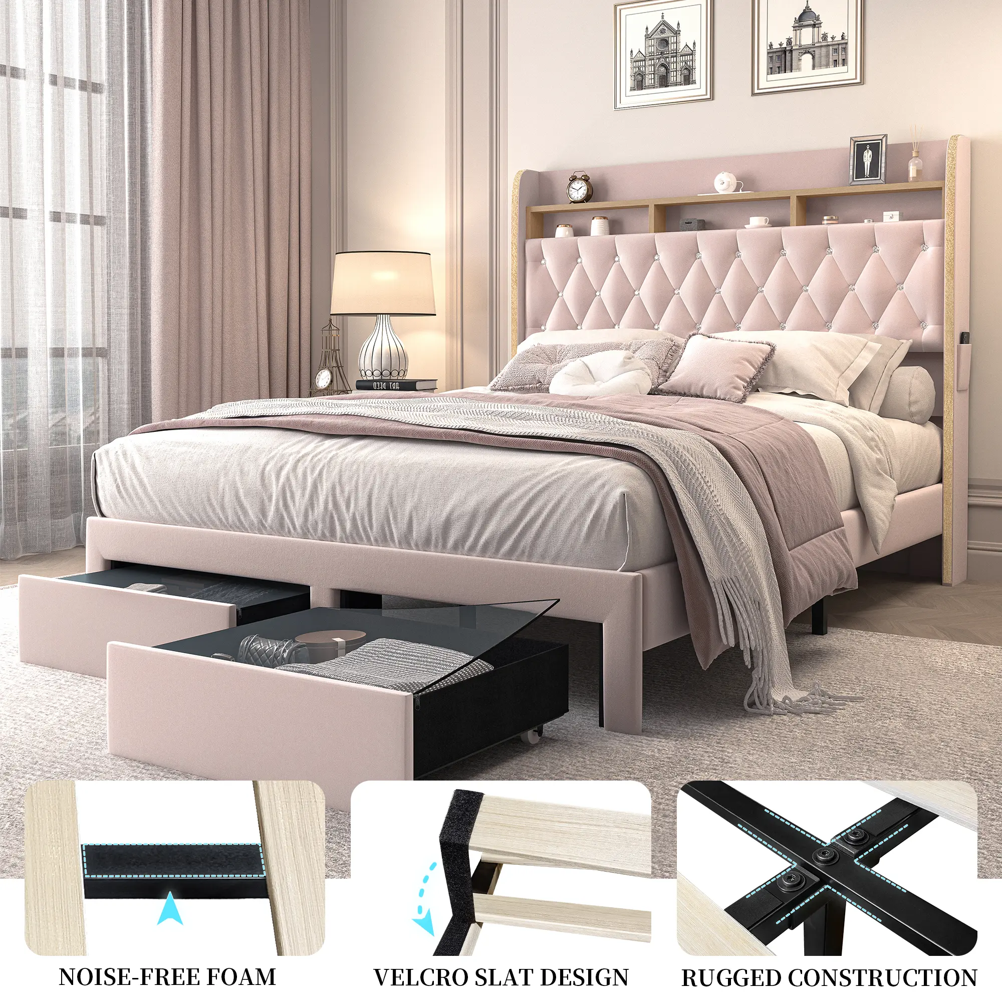 Stay stylish and organized! This bed frame includes a smart headboard with storage for your books, watches, or decor. Plus, 2 large foot drawers on smooth wheels provide hidden under-bed storage