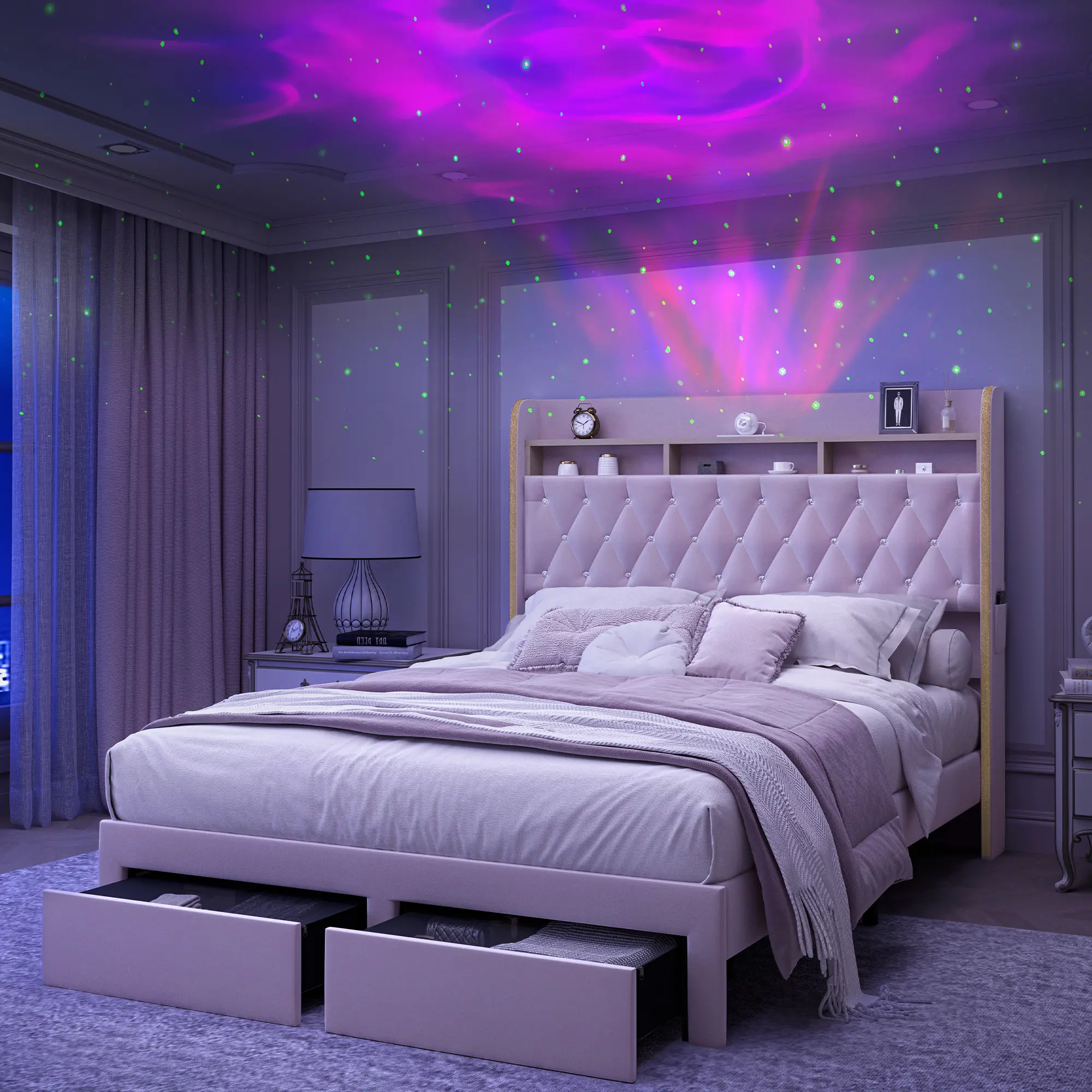 Transform your bedroom with the Aurora bed frame! Featuring customizable RGB LED lights and 8 ambient white noise options, it syncs to your music via remote or smartphone. Create a vibrant, immersive modern bedroom vibe