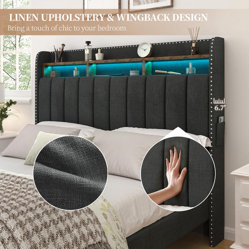 This storage platform beds has 2 open compartments and has 2 pockets on either side of the headboard, perfect for storing small items such as books, remotes, cell phones, and other personal items to keep your space tidy. The headboard is made of soft-touch (linen fabric/PU) and built-in soft foam with high elasticity for optimal support and comfort for your back