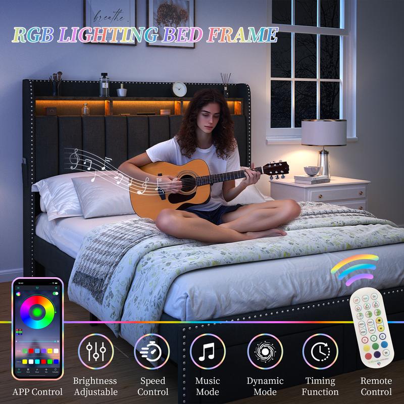 Transform your sleep space with our queen smart bed frame, featuring customizable LED lights for a personalized ambiance. Adjust color, brightness, mode via remote or mobile phone APP, change the light when you are lying on the bed, which not only can create captivating atmospheres for your bedroom, but also can be used as night light