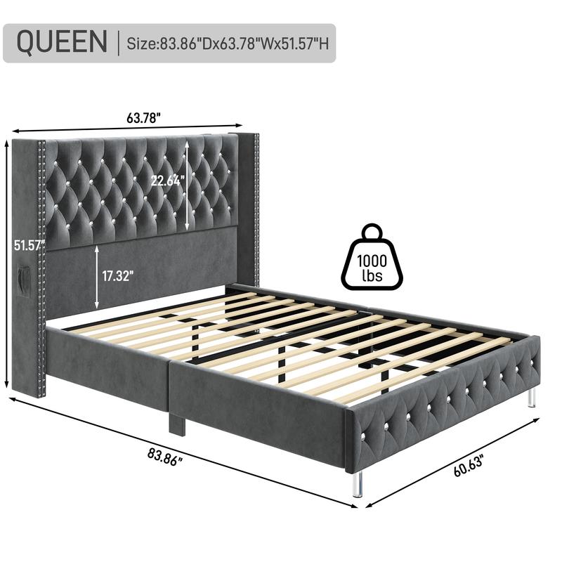·Sturdy and Quiet: Wood slat adopts a screw-fixed design to provide solid support and can support up to 1000 lbs. The dark grey velvet bed frame queen is equipped with EVA silent pads to firmly secure the mattress and keep it quiet and you don't have to worry about noise.