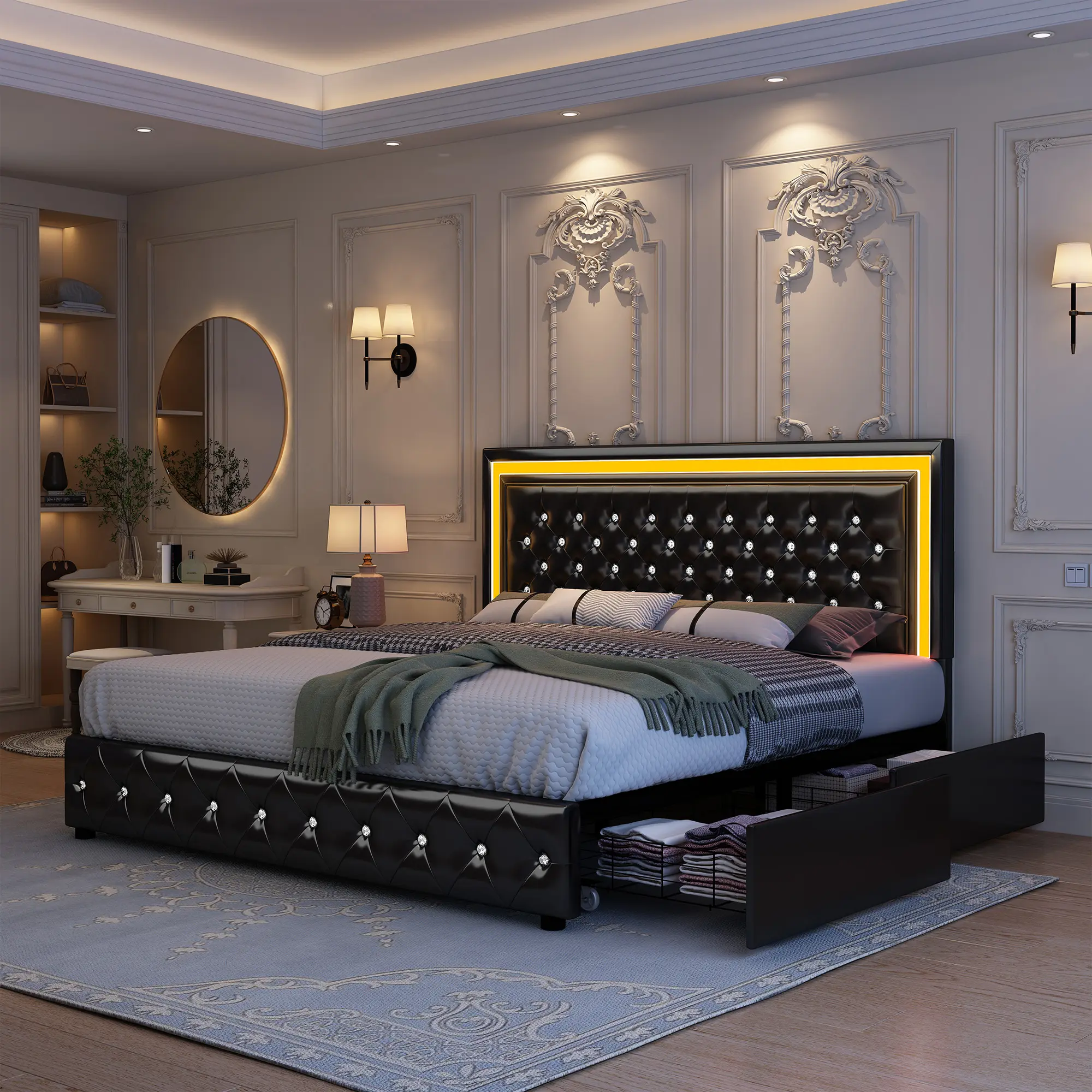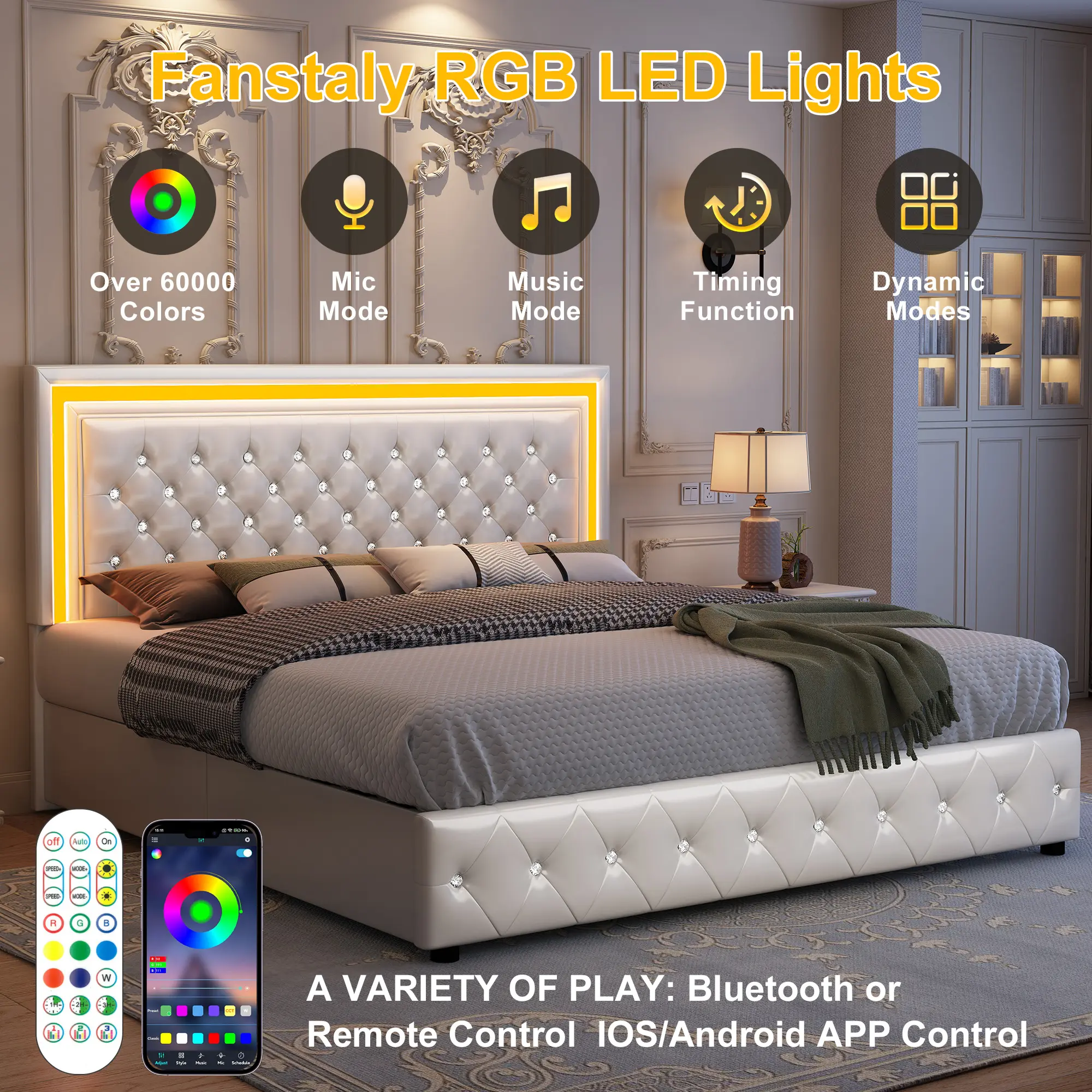 Smart RGBW LED lights built into the adjustable headboard, controllable via mobile app or remote. Multiple colors, dynamic modes, and Music Sync let lights pulse to the beat for an immersive bedroom or gaming vibe.
