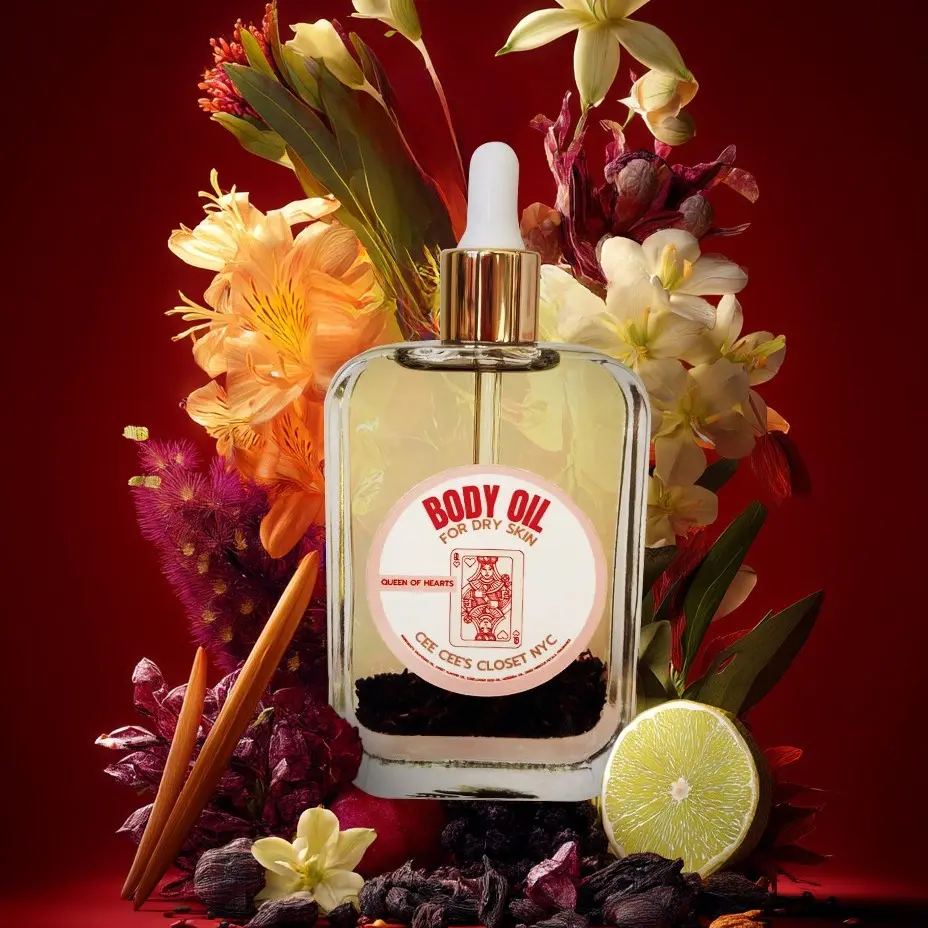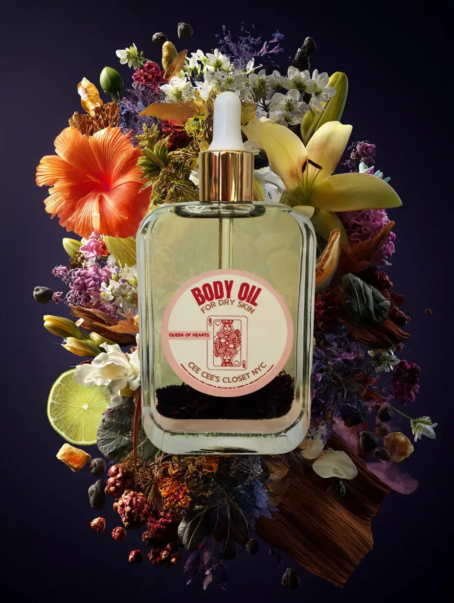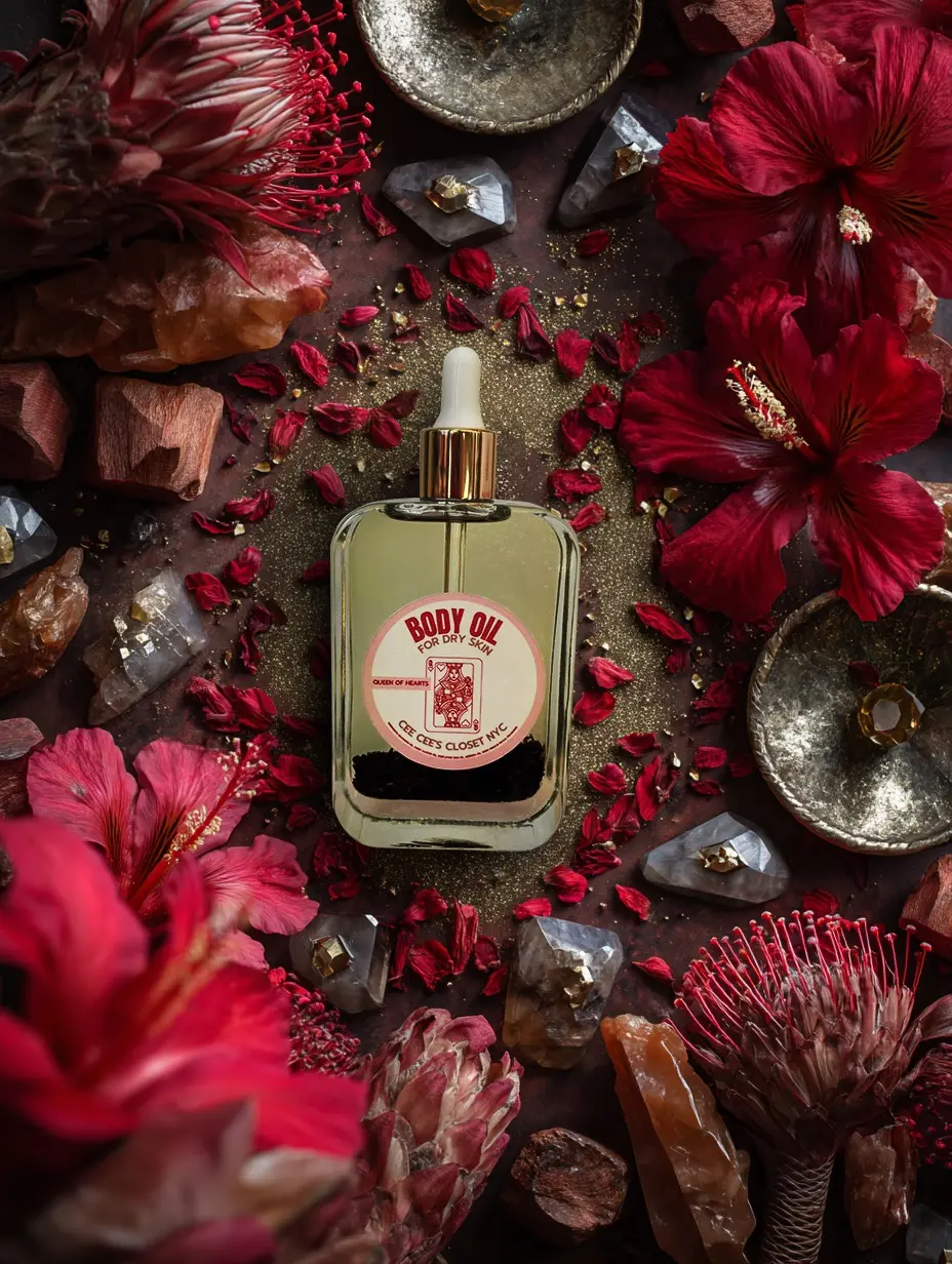 Reign supreme with Queen of Hearts, a captivating scented dry oil that envelops your skin in luxurious hydration and an unforgettable aroma. This exquisite blend of nourishing sunflower, sweet almond, moringa, and grapeseed oils absorbs quickly, leaving your skin feeling velvety smooth and radiantly healthy.