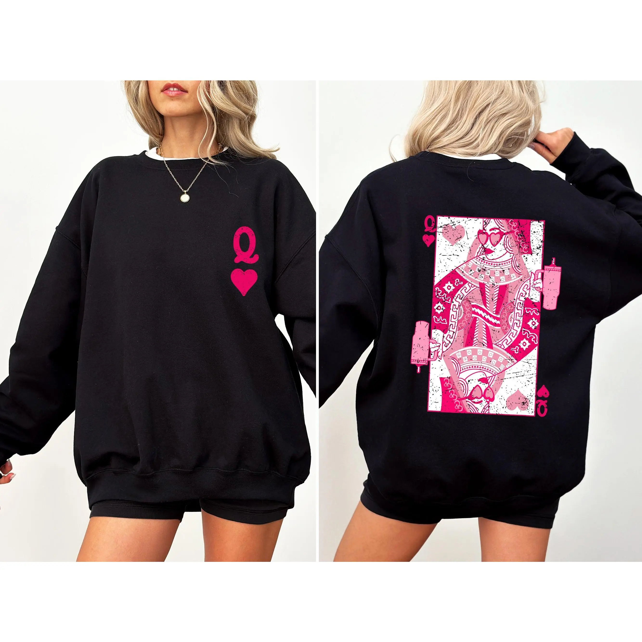 This Queen of Hearts, Cards, Games, Valentine's Day Sweatshirt pairs effortlessly with jeans for a chic, relaxed look or can be layered over shirts for added warmth and style. It’s ideal for both cozy nights in and lively gatherings with friends where games and laughter abound.