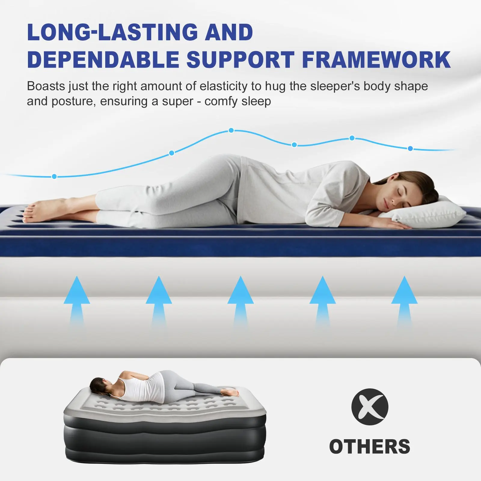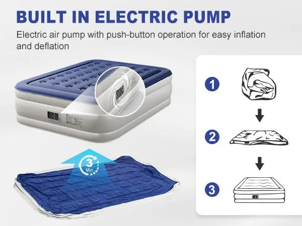 1. Quick 4-Minute Setup with Built-in Pump: No more waiting around—this queen air mattress inflates and deflates in just 4 minutes using the built-in electric pump with separate inflate/deflate controls, saving time and effort.