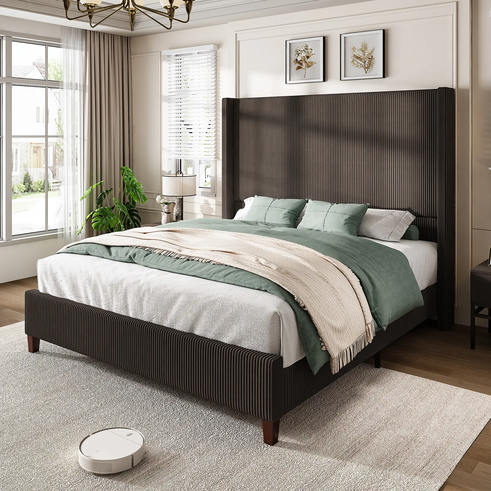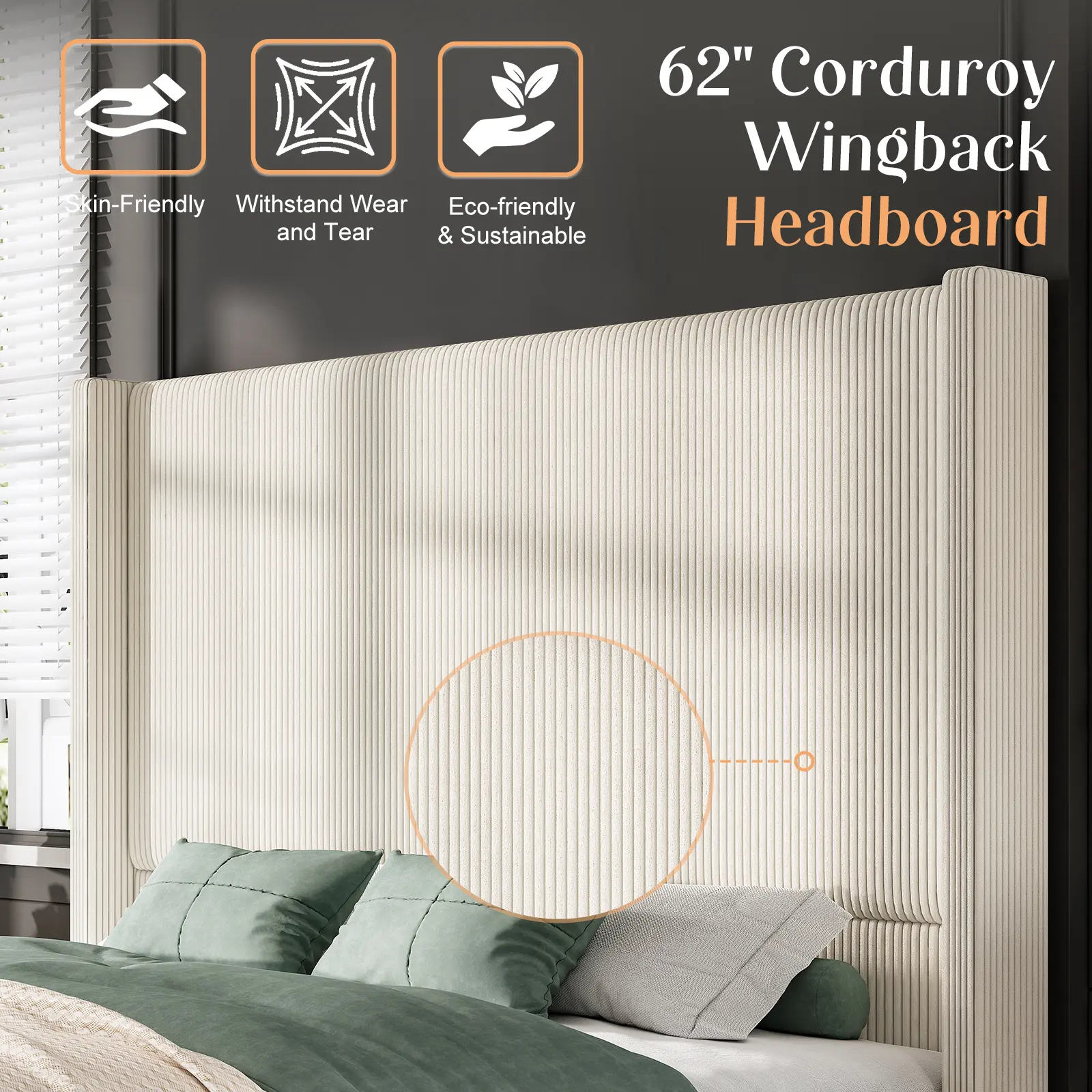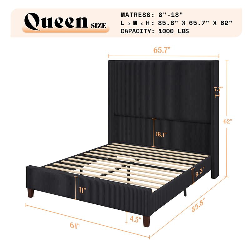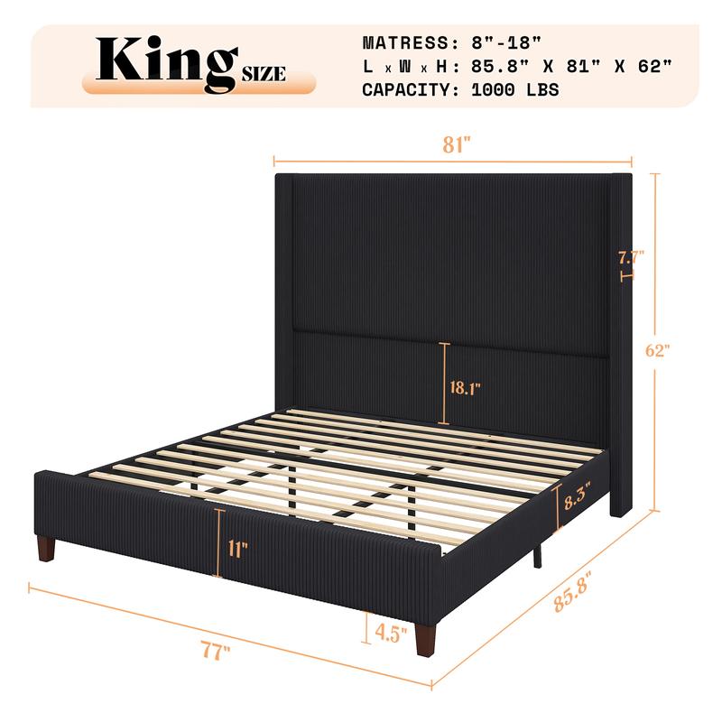·62" TALL WINGBACK HEADBOARD: Extra high headboard with a classic wingback design offers enhanced support for your neck and back, creating a luxurious atmosphere and elevating the sophistication of your entire home.