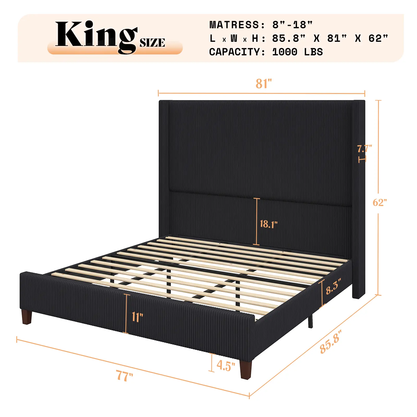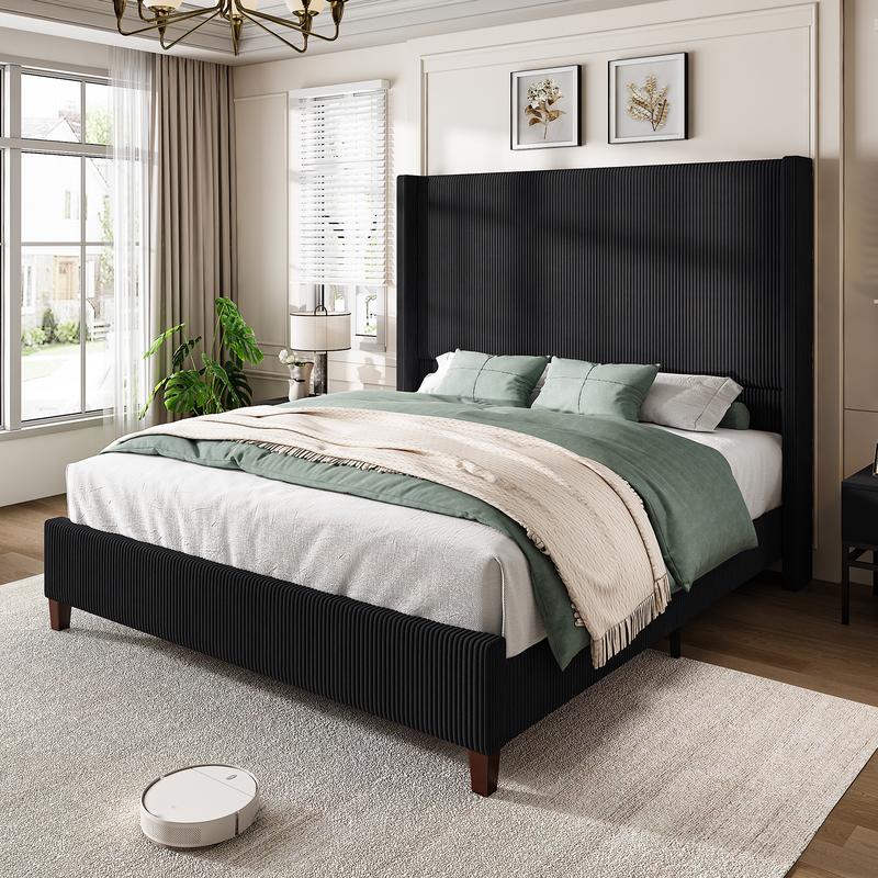 ·CORDUROY FABRIC: Upholstered with premium luxurious corduroy featuring vertical channel tufting, this soft-textured fabric provides lasting comfort and adds an opulent touch to your bed.SOLID WOOD LEGS: Features 4.5-inch walnut-colored quadrate-tapered legs, ensuring superior stability and easy cleaning. Its exquisite appearance makes it a perfect embellishment for a bedroom.