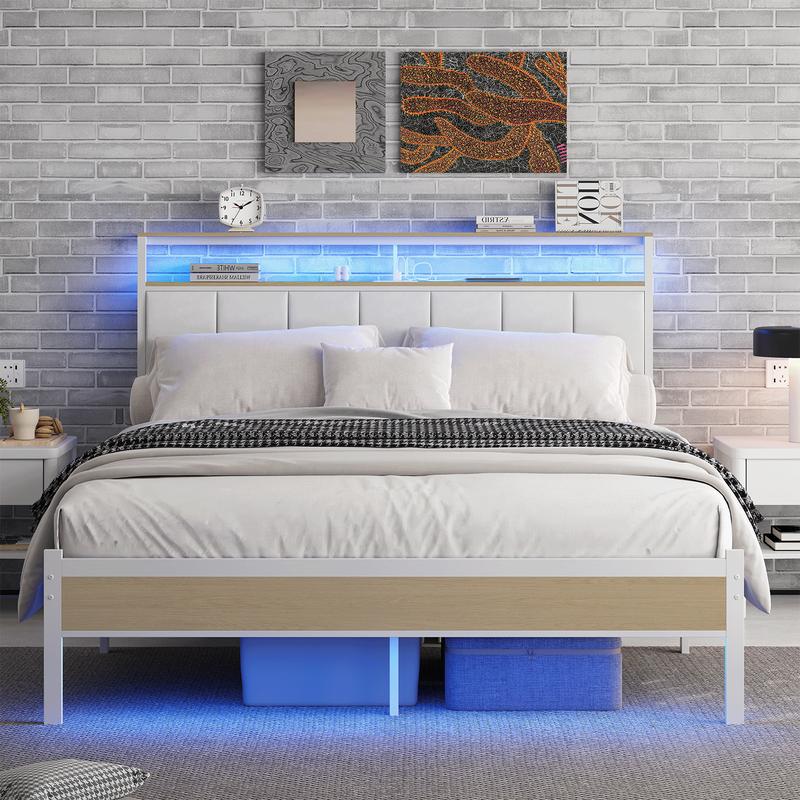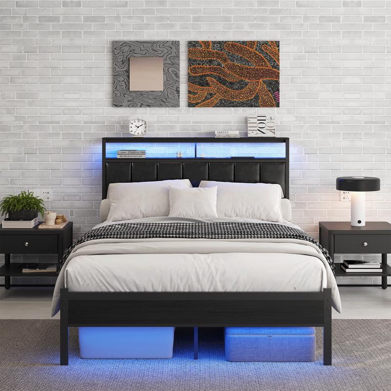 Queen Size Bed Frame with Charging Station and LED Lights, Black Upholstered Headboard with 2-Tier Storage Shelves,Metal Bed Frame with Headboard, No Box Spring Needed, Easy Assembly, Black