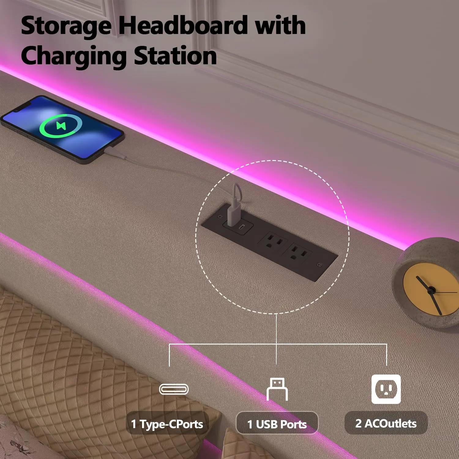 ·【Storage Headboard with Charging Station】The headboard has a built-in charging station with 2 AC outlets, 2 USB ports (including Type-C), and a shelf for storing phones, tablets, magazines, and more—keeping essentials close and charging hassle-free.
