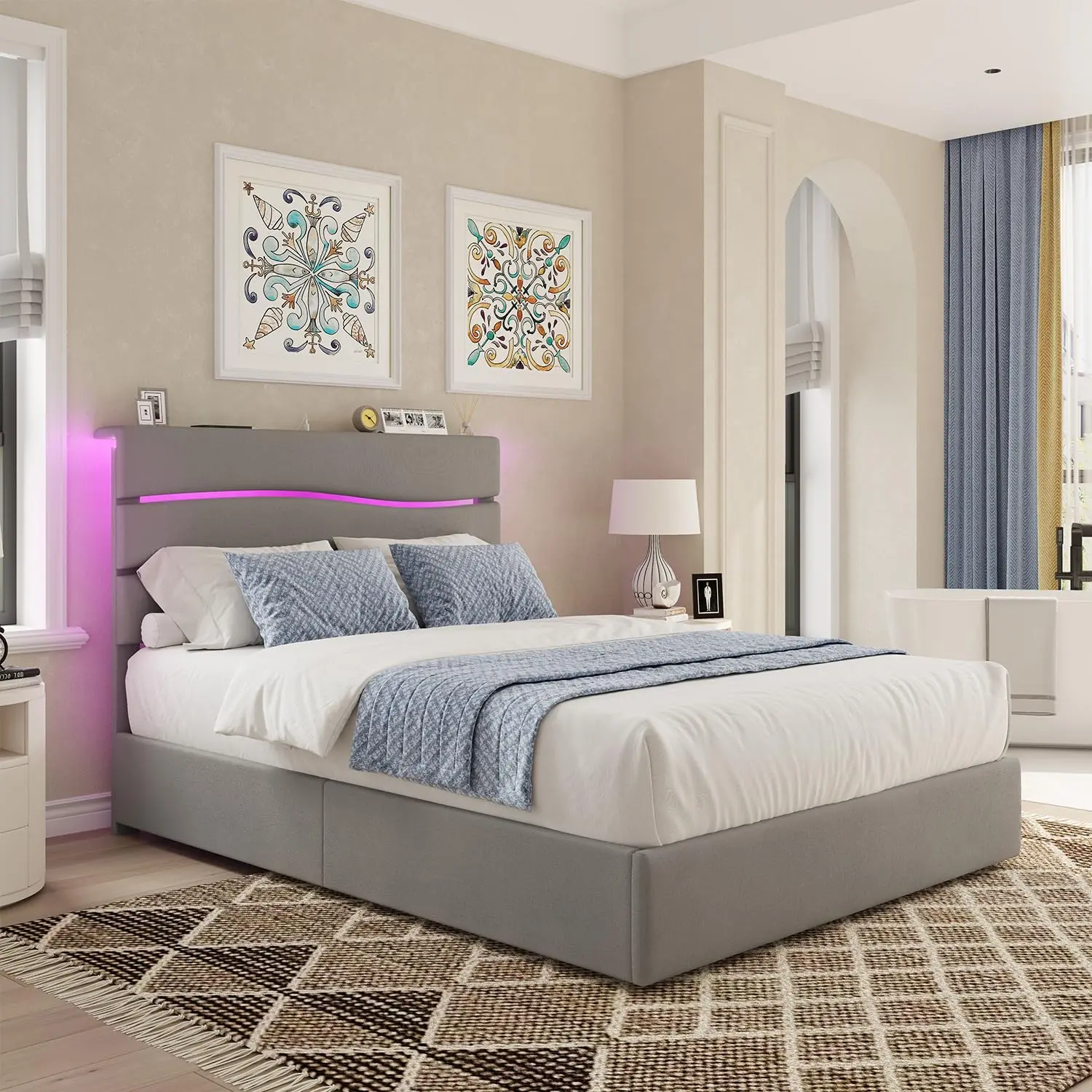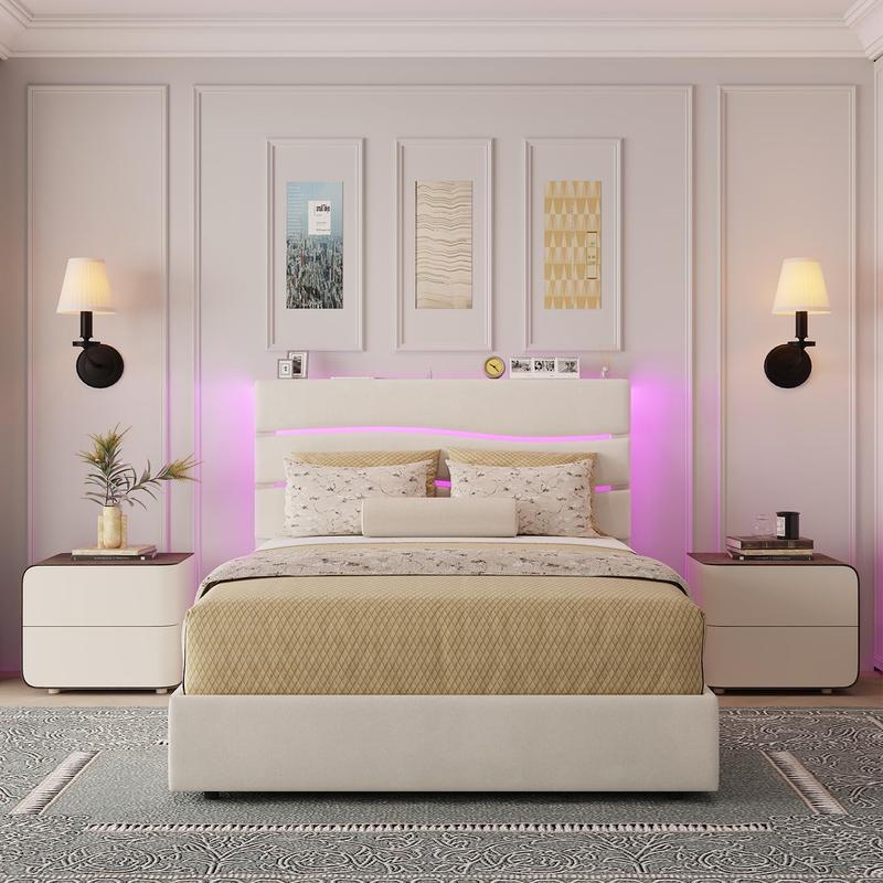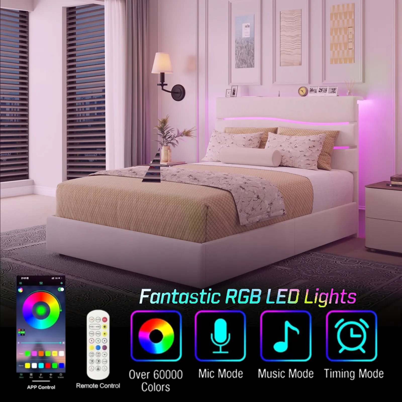 ·【RGB LED Light Bed Frame】This bed frame features RGB LED lights on the headboard, with 12 scene modes, 3 speed and brightness levels. The headboard-mounted controller and remote allow easy adjustments. Multi-color LEDs create a vibrant, romantic ambiance with customizable brightness, color, speed, mode, and timer.