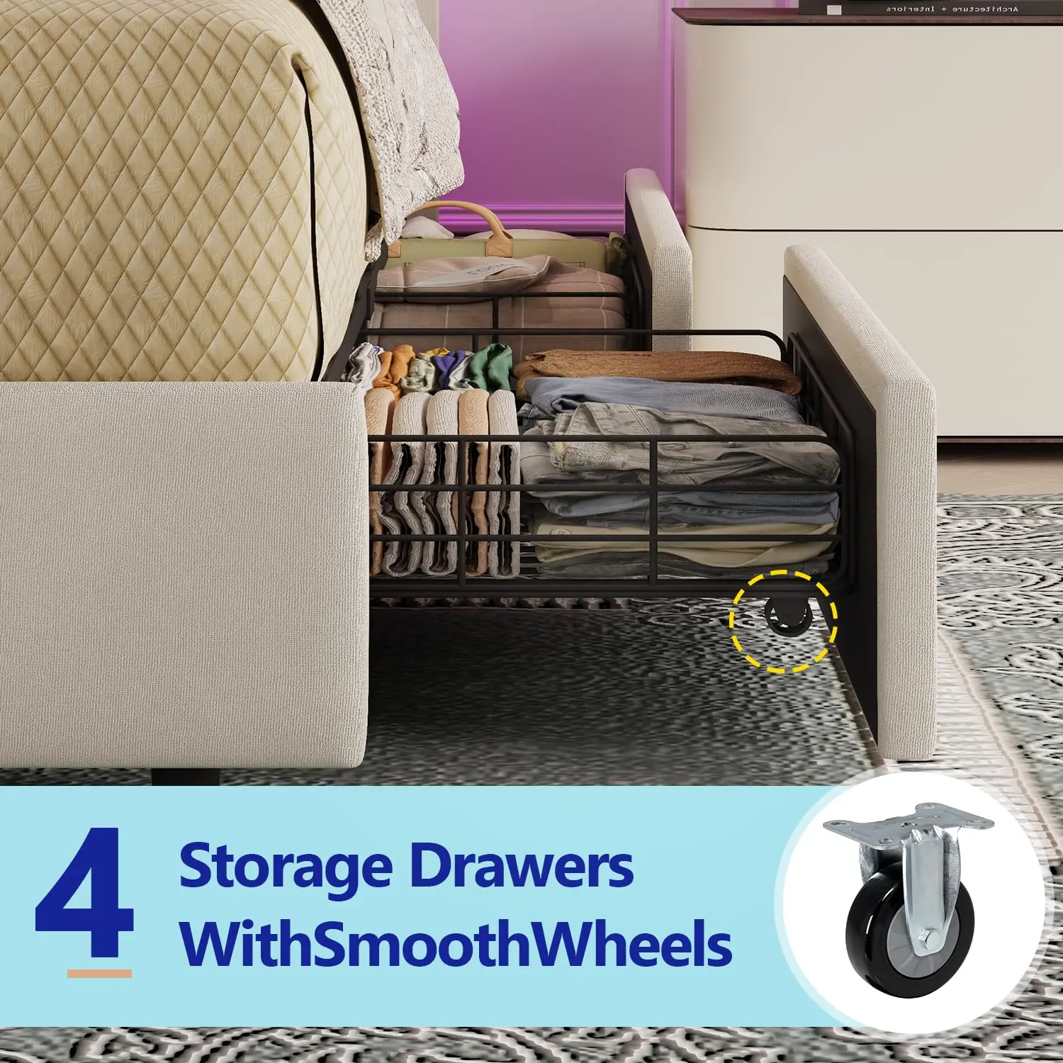 ·【4 Sliding Storage Drawers】This bed frame has 4 large sliding drawers with screw clips to securely store seasonal bedding, clothes, and sundries, maximizing space and keeping the room tidy.