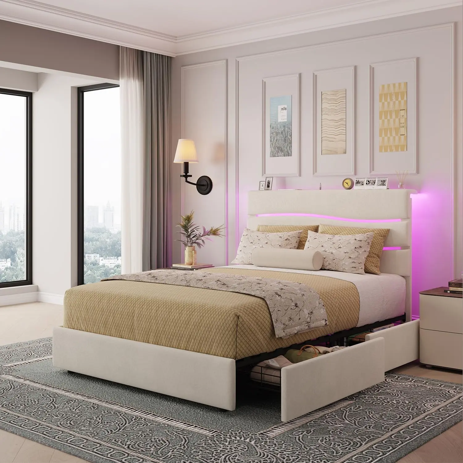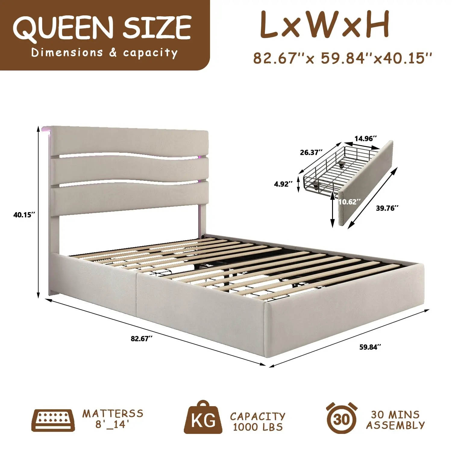 ·【Easy Assembly】Designed for an easy assembly, this queen size bed frame with storage comes with clear instructions and all the necessary tools to allow you to assemble it quickly and effortlessly.