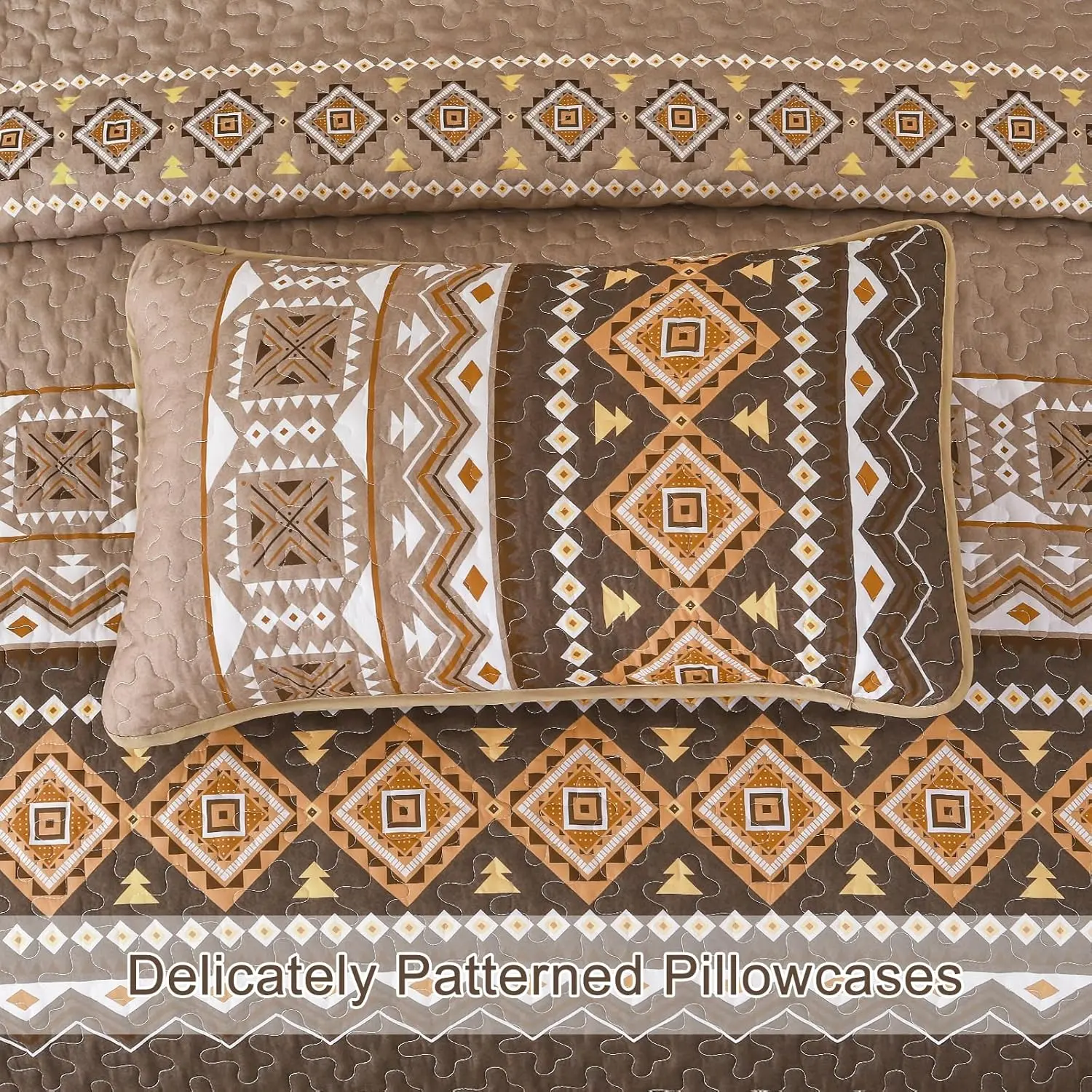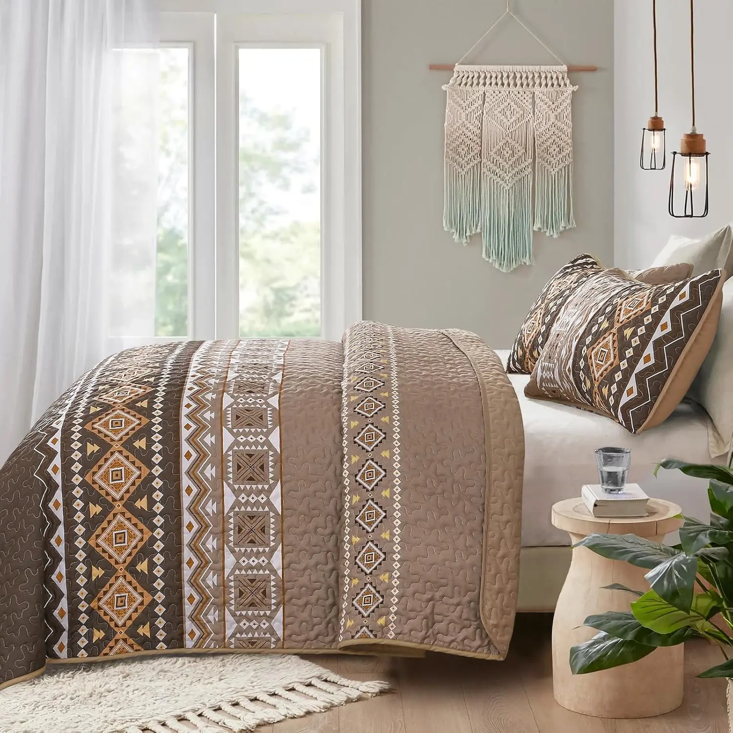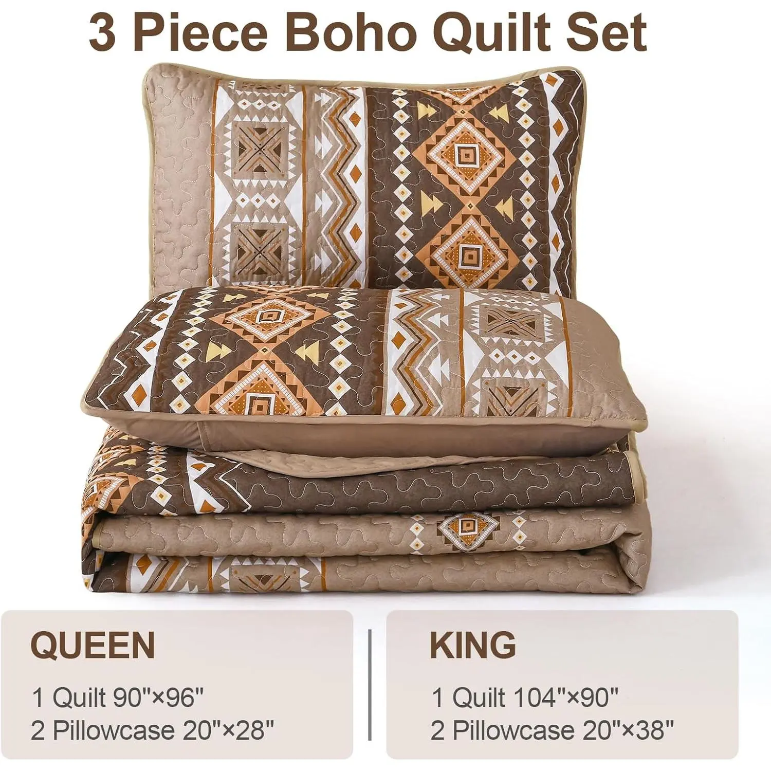 [Boho Quilt Set Queen]Boho quilt set queen size includes:1 queen quilt 96"*90",2 pillowcases 20"*28".Brown bedspread quilt set, the perfect gift for family and friends.[Brown Geometry Bedspread Set]Simple and vintage brown with classic geometric pattern makes boho bedspread set more atmospheric and adds an elegance and stability to the bedroom.[3 Pieces Boho Bedding Set]Boho bedding set queen is made of 100% microfibre.Soft, cosy and breathable.For your comfort and peace of mind for a good night's sleep![Bohemian Coverlet Set]Bohemian brown coverlet set pursues perfection from material to production, carving every inch of detail with care to give you a perfect experience![Summer Quilt Set Queen]Machine wash cold, tumble dry gently, do not bleach.Different color difference under different light.If you have any questions, please do not hesitate to contact us.