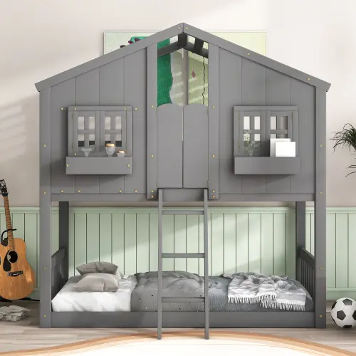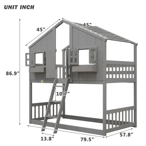 ·Wood House Roof Bunk Bed: Unique design with windows, door, and ladder, providing endless imagination and access to natural woods. Adds fun and creativity for kids. Allows for various decorations and accessories on the window boxes.