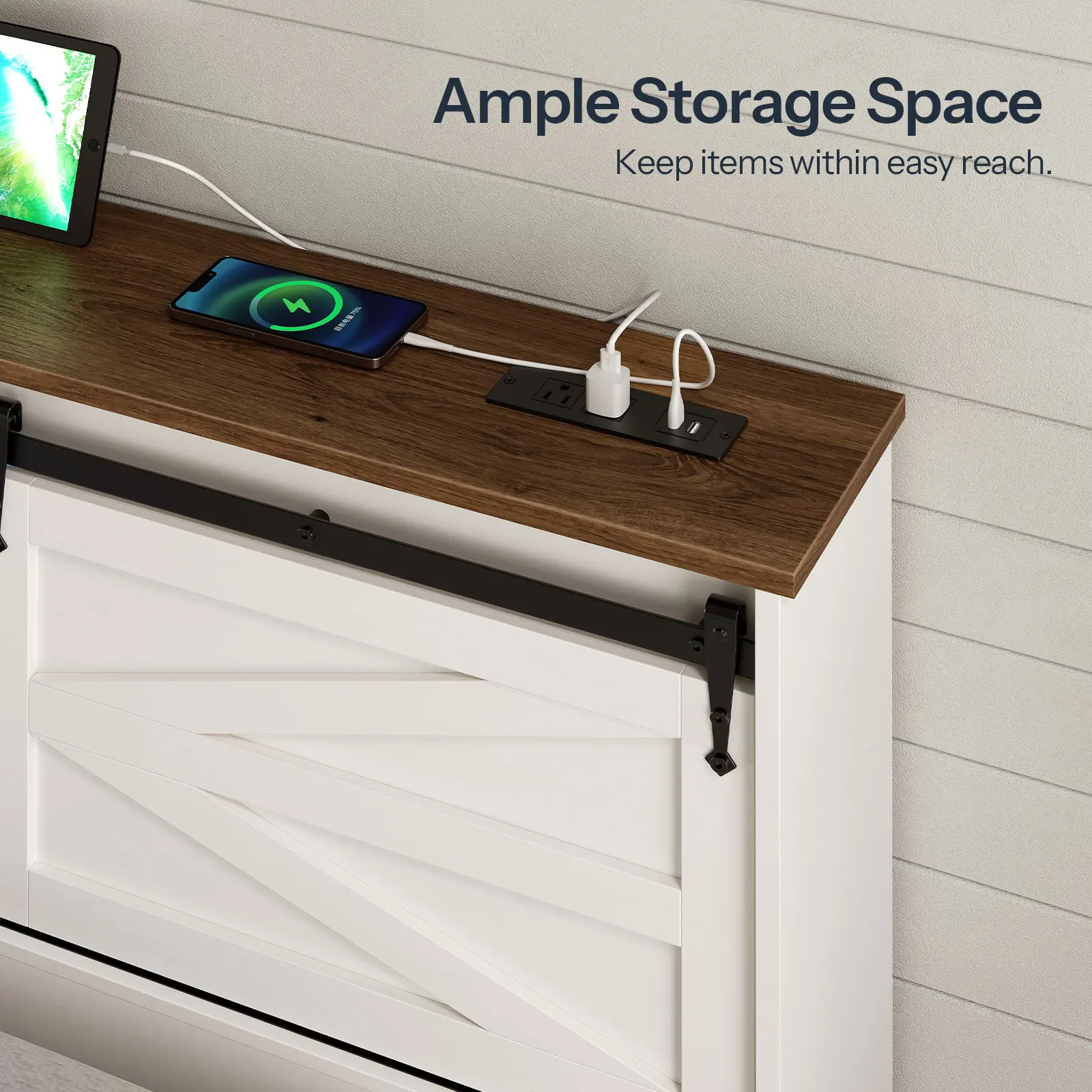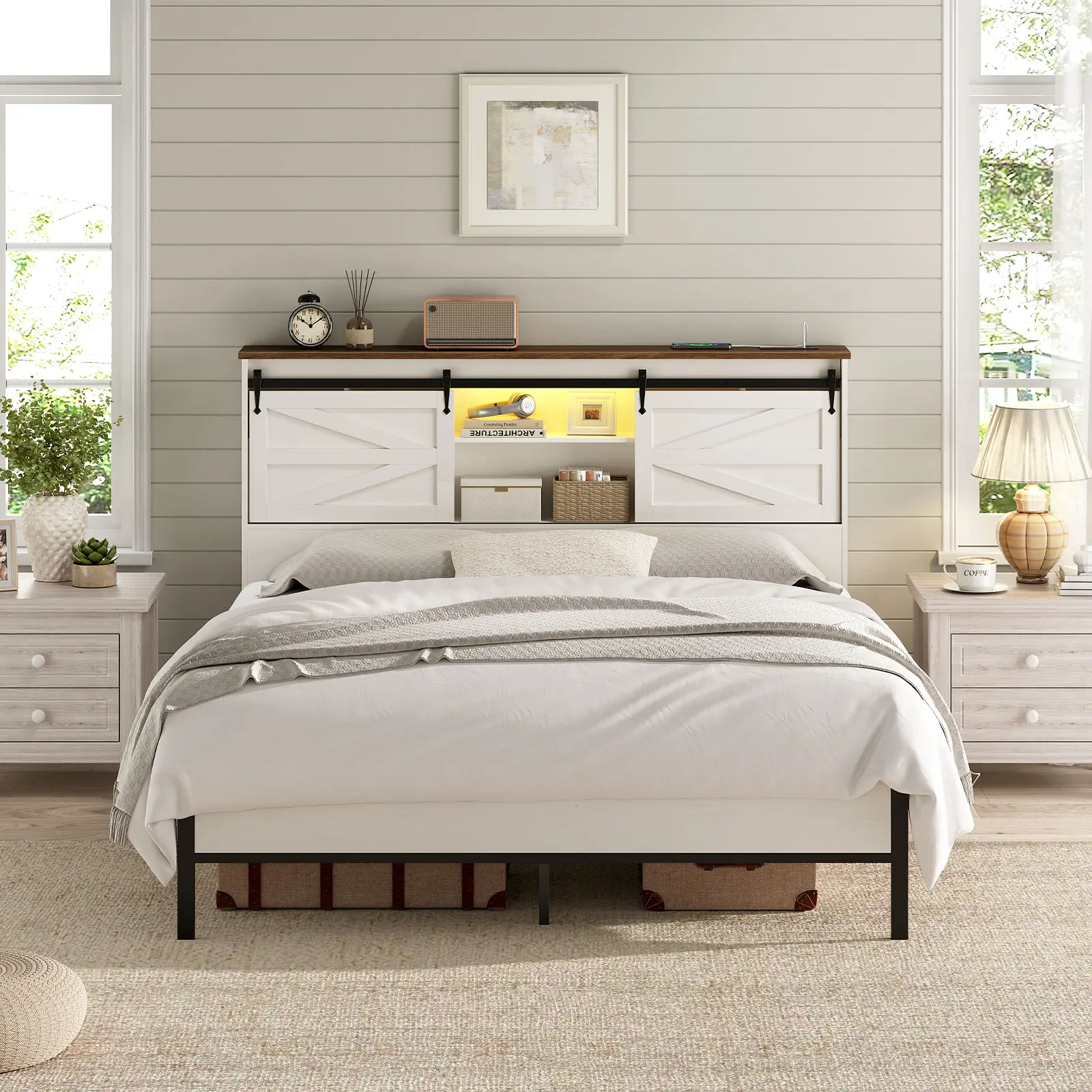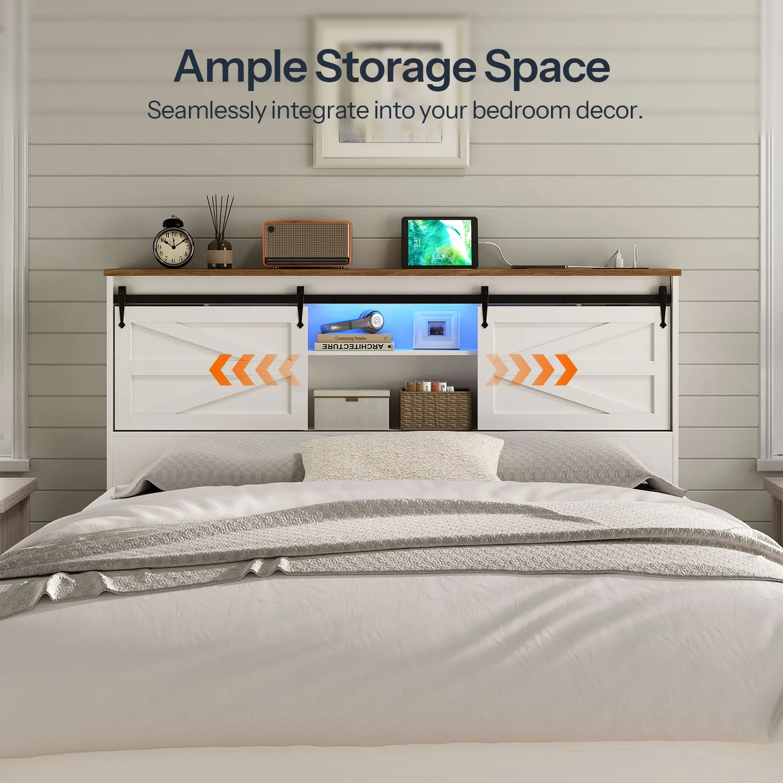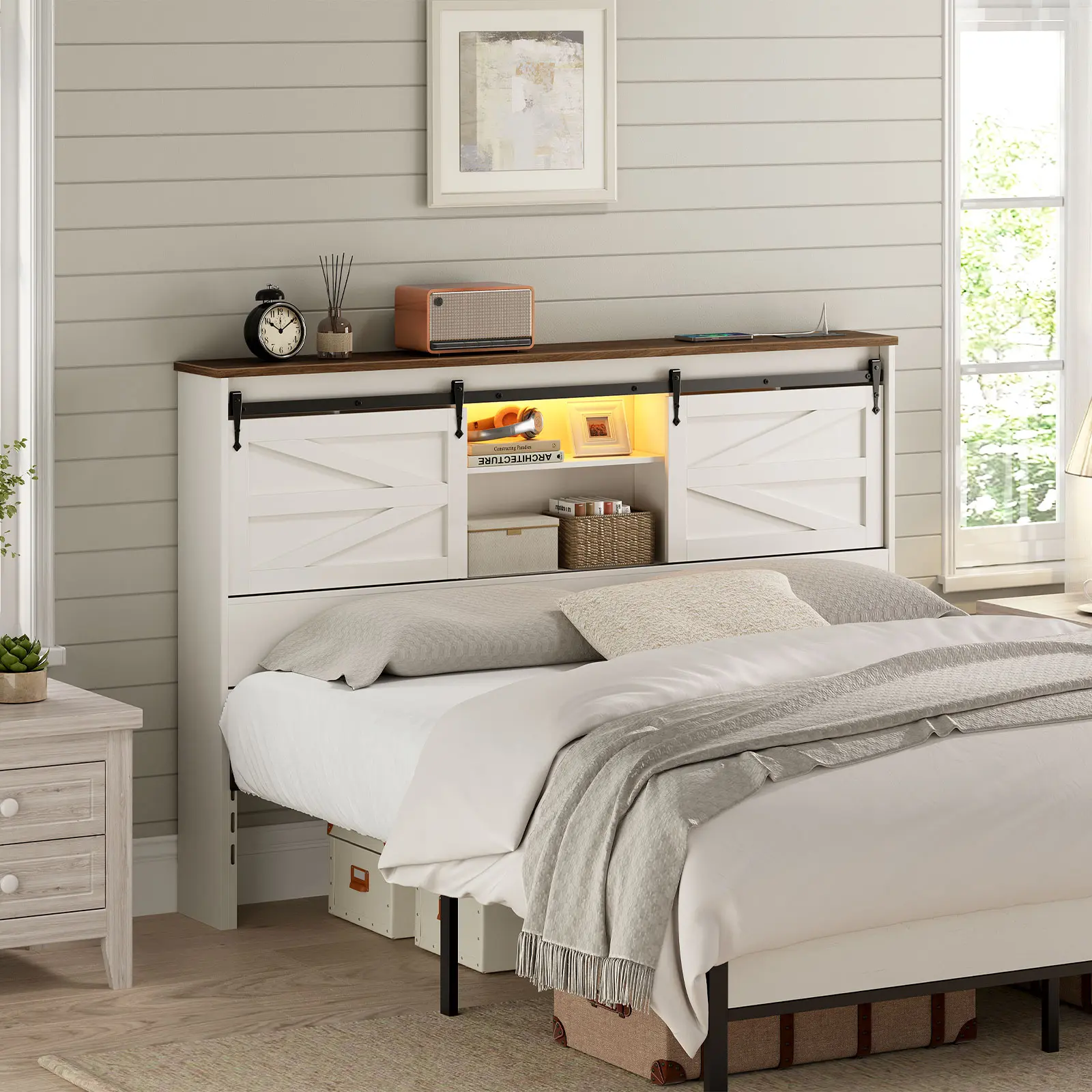 This headboard with storage captures the essence of barn door design, perfectly blending traditional farmhouse aesthetics with modern decorative styles that bring a unique charm to your bedroom and complement modern decor.