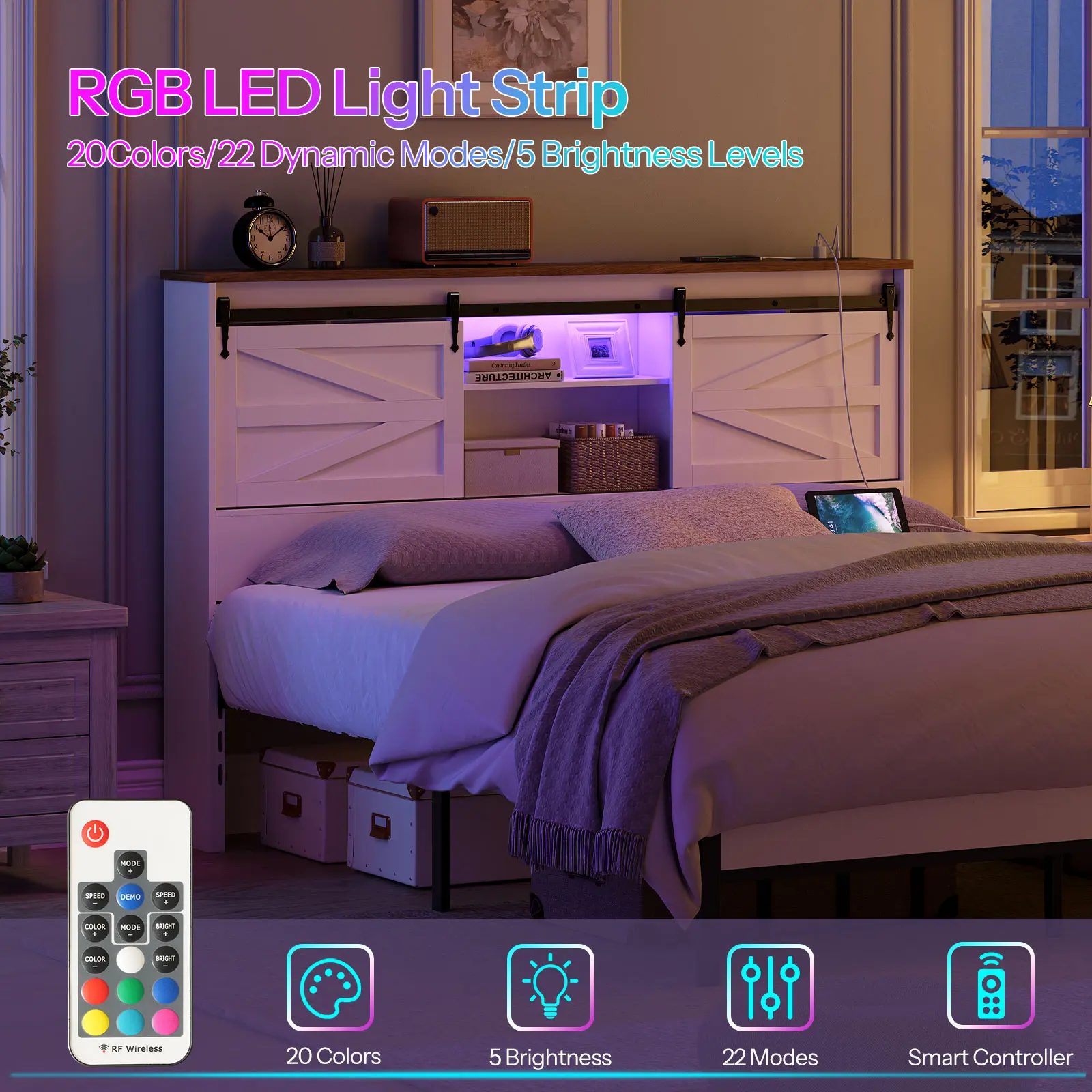 The bookcase headboard is equipped with LED lights that offer 20 colors and lighting modes, allowing you to easily adjust the light effects according to your preferences and room atmosphere, creating a warm and cozy ambiance.