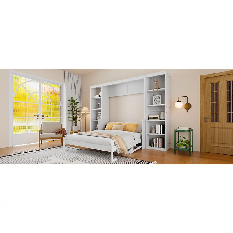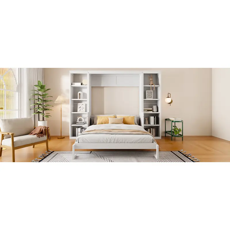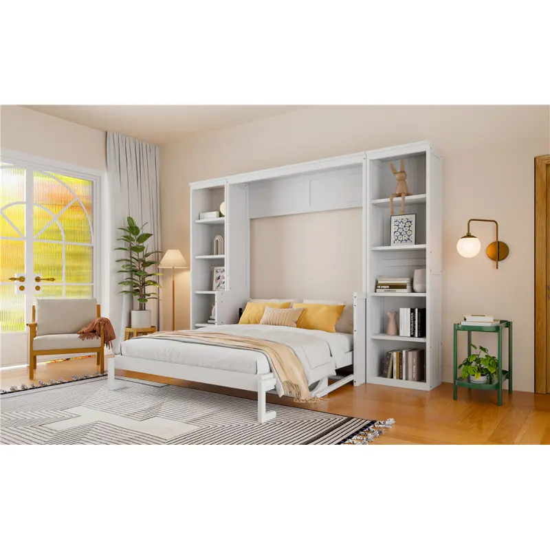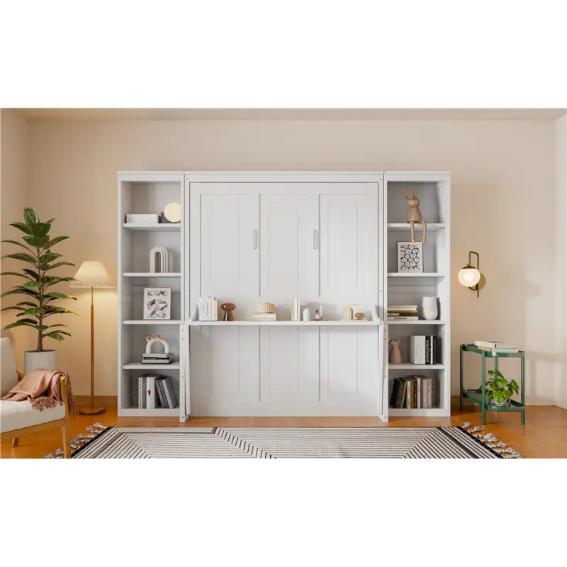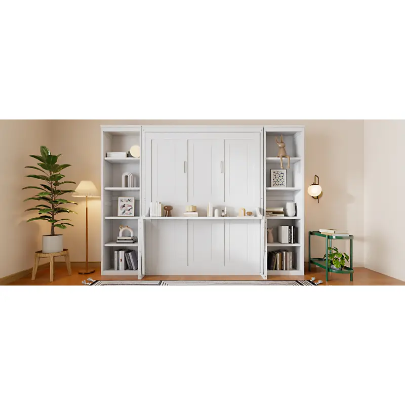 Queen Size Murphy Bed with Desk and Bookshelf, White
