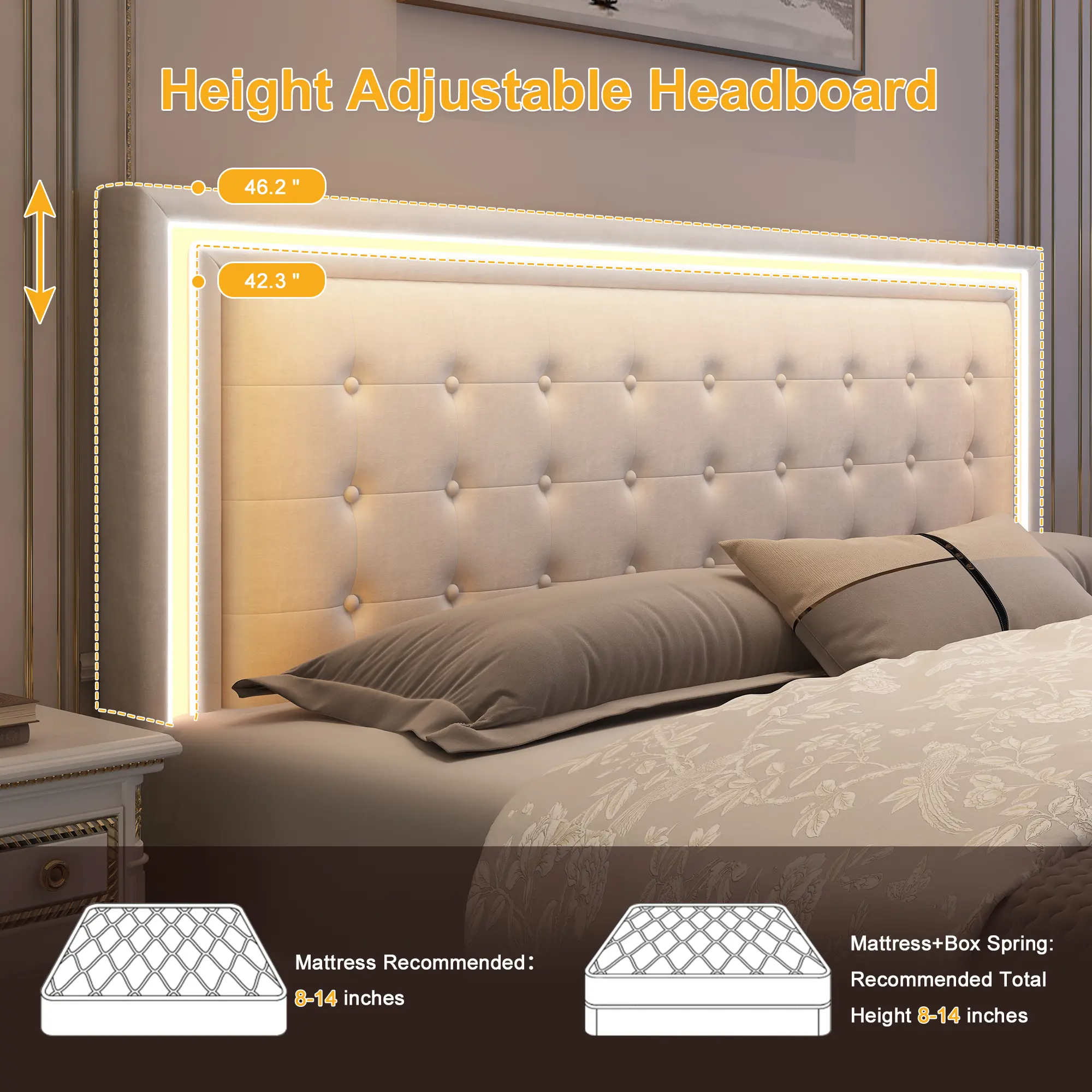 Adjustable Upholstered Headboard: Soft PU upholstered headboard with a modern square design and 3 height adjustments, suitable for 8"–14" mattresses. Designed for comfort, support, and a stylish bedroom upgrade.