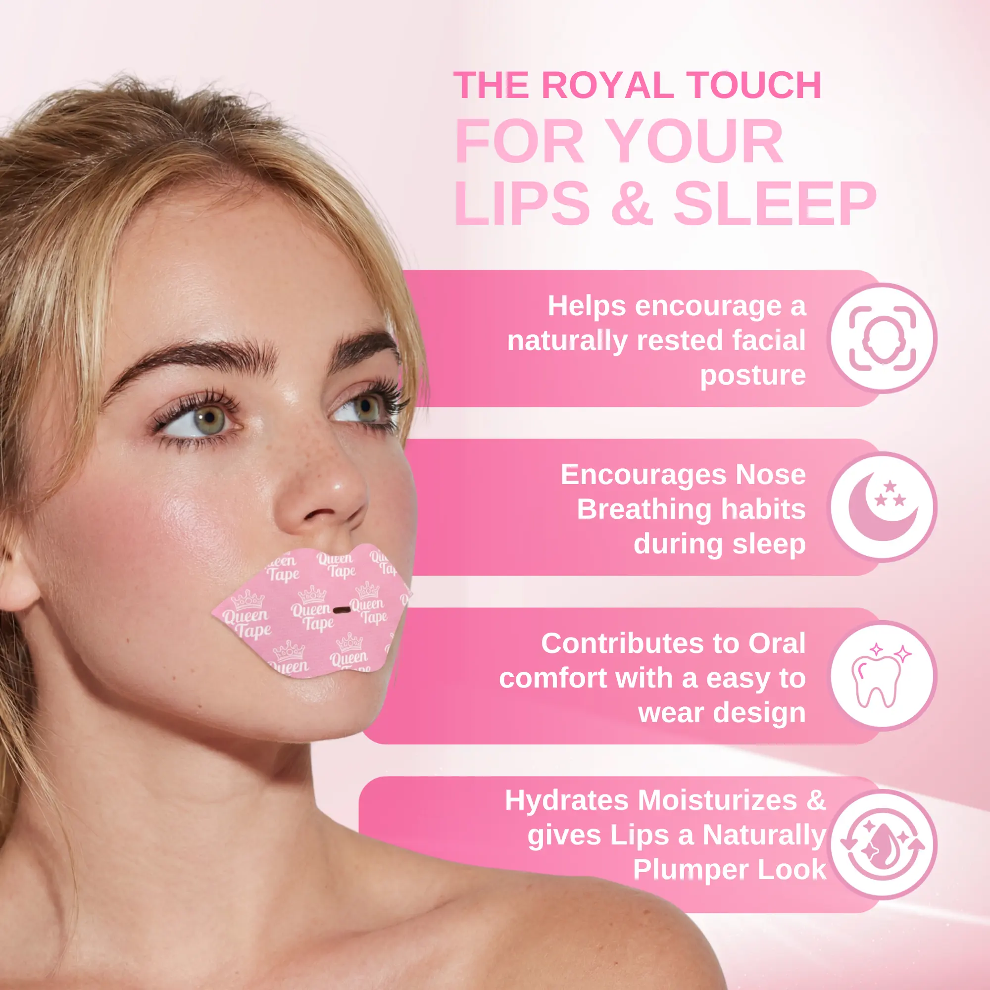 Drift into deep, restorative sleep and wake up with soft, hydrated, fuller looking lips with Queen Tape: Royal Plump Edition. Specially crafted for women, this premium edition blends advanced sleep support with lip-plumping hydration to help you wake up refreshed, radiant, and confident.