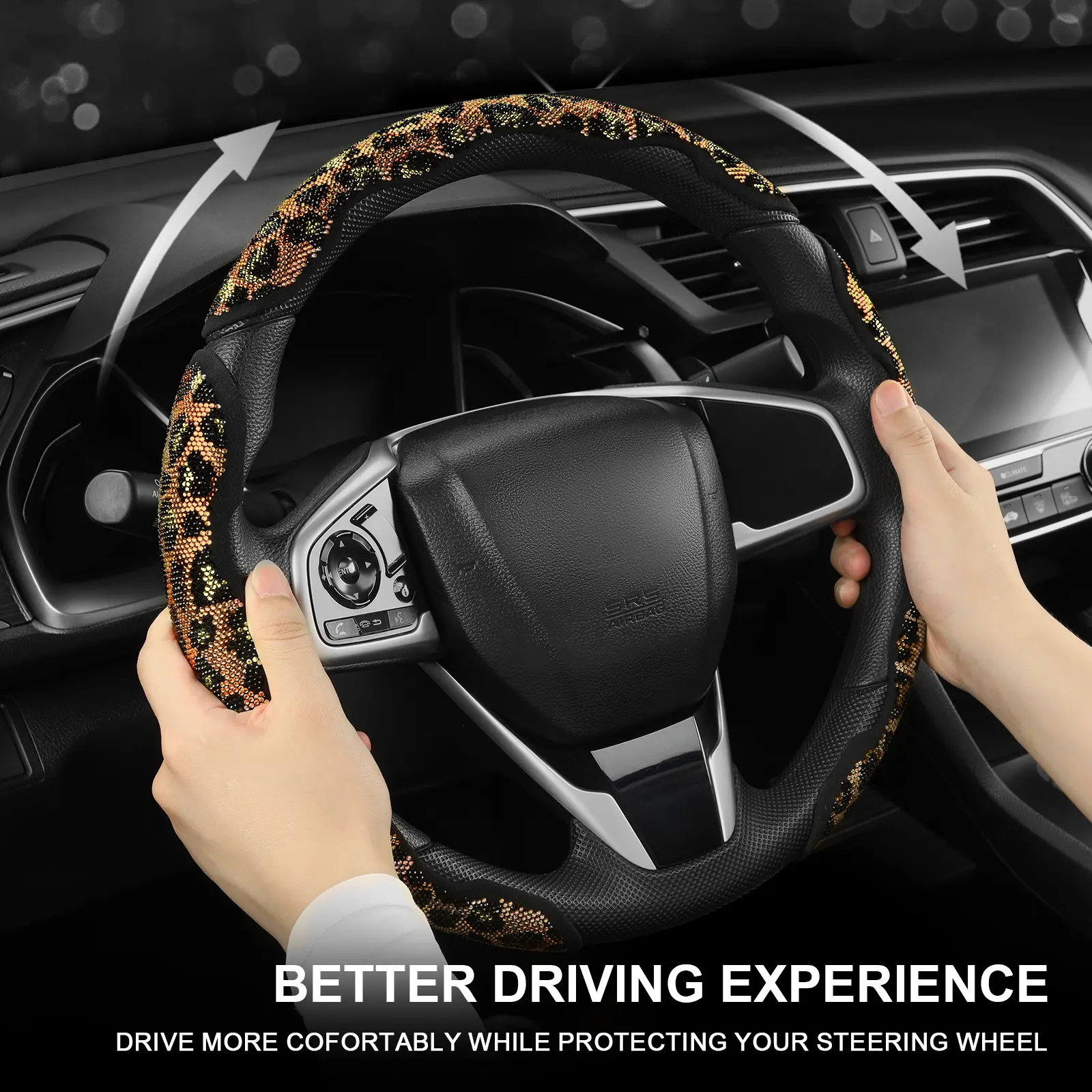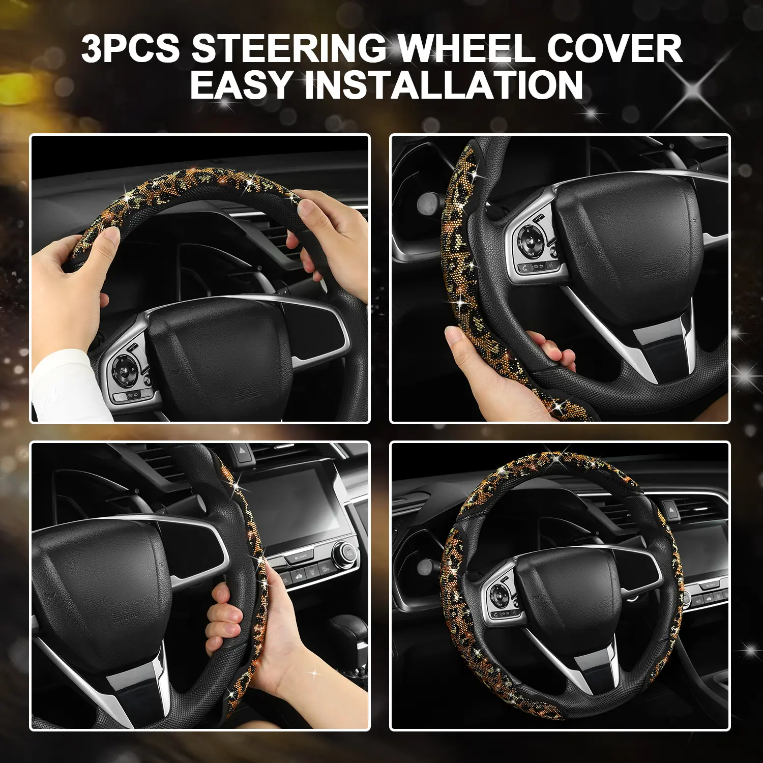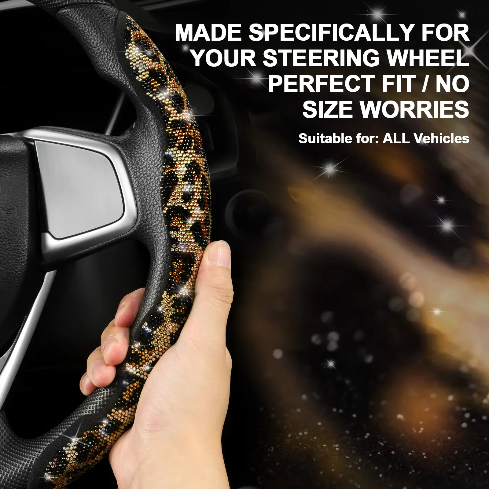 The best steering wheel cover!!! i didn’t know how it was supposed to stick with no glue but it fits just right after you push it onto the wheel, really snug doesn’t slip when i turn or anything, it doesn’t “hurt” your hands it’s just rhinestones so don’t grip them that hard lol and they stay on!