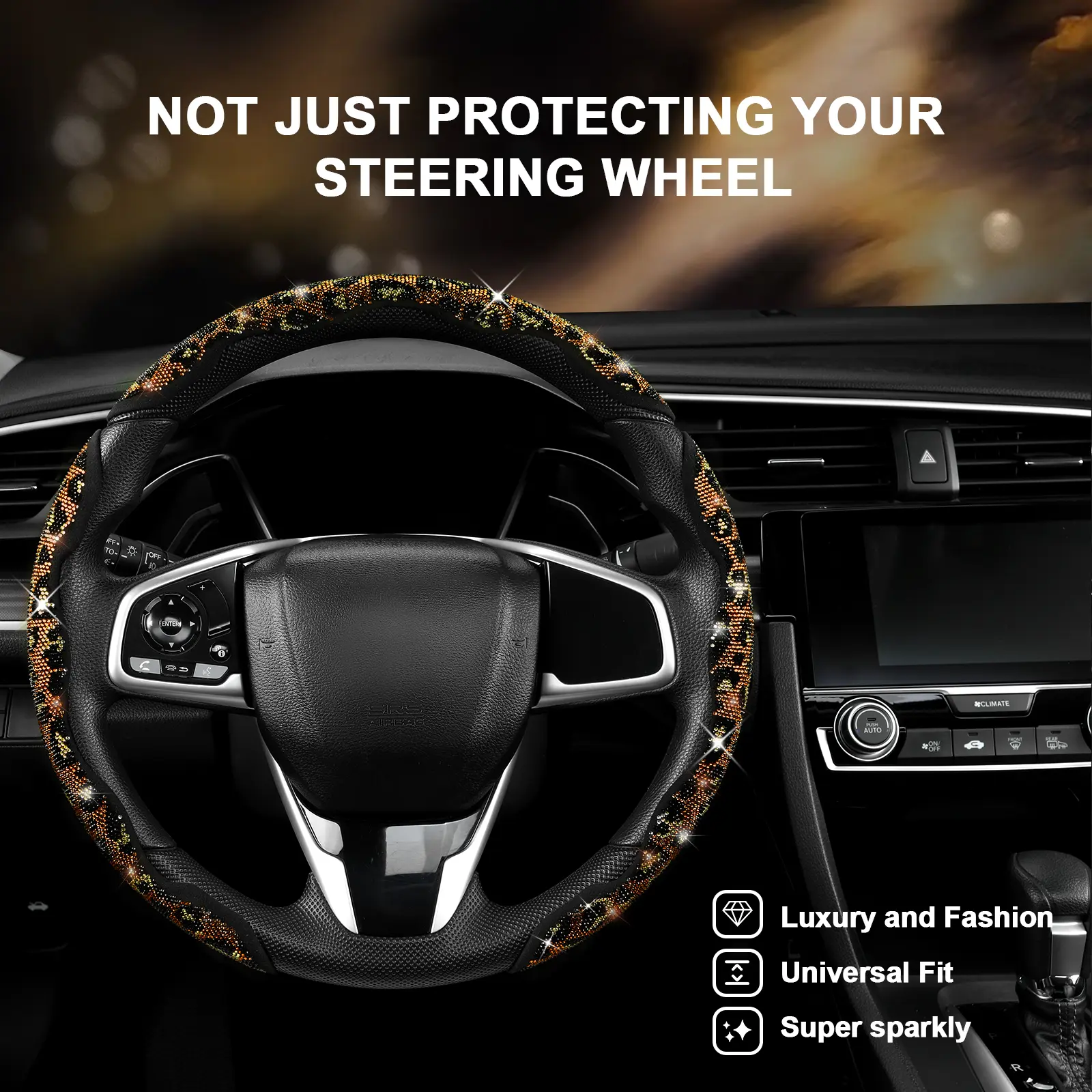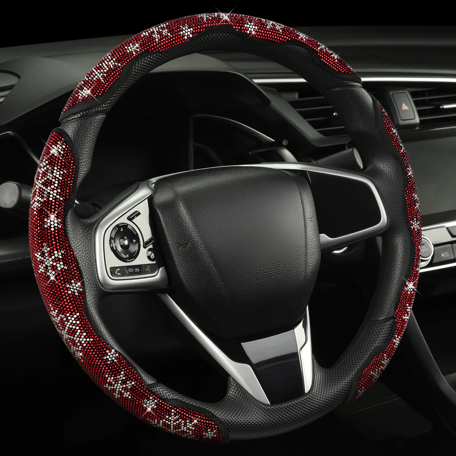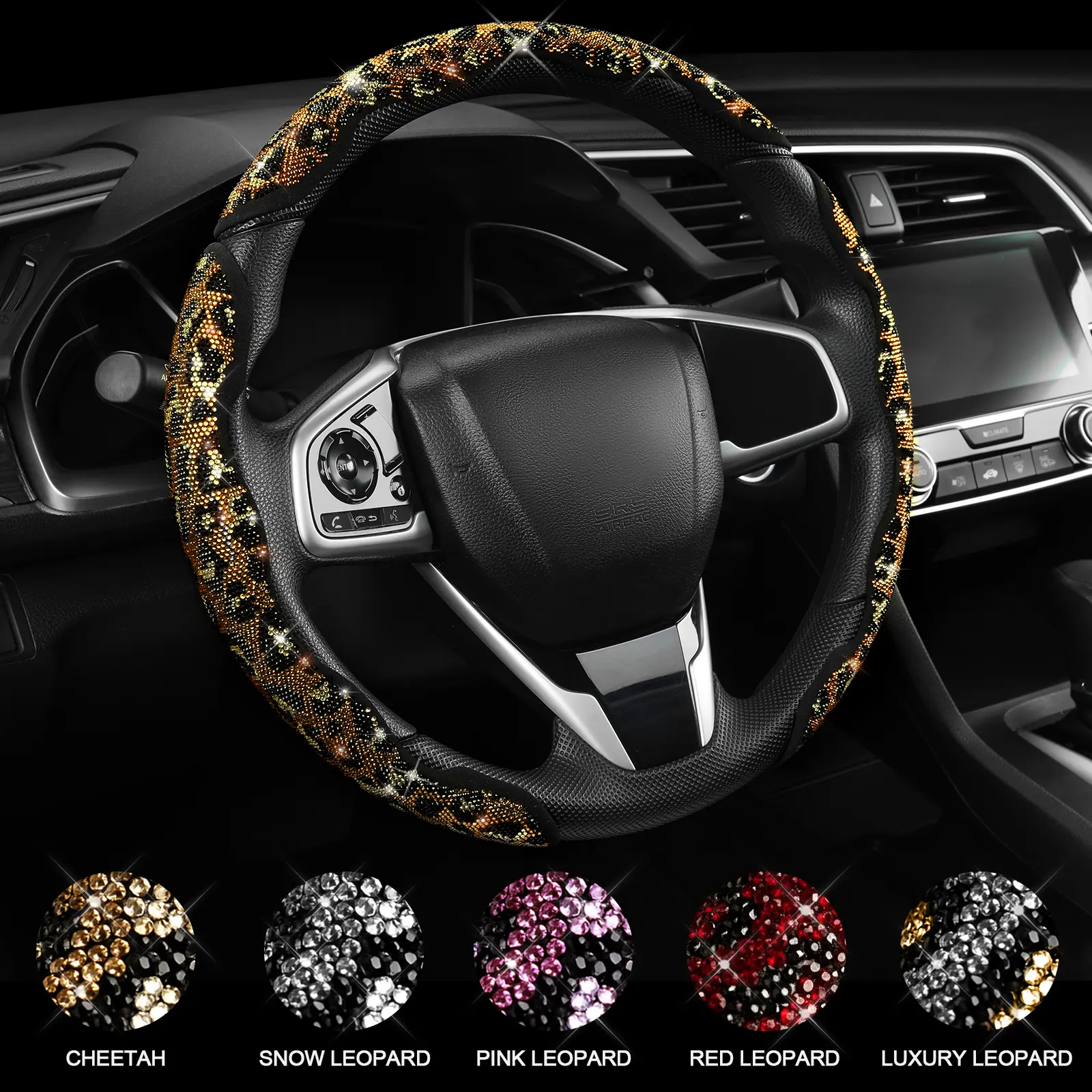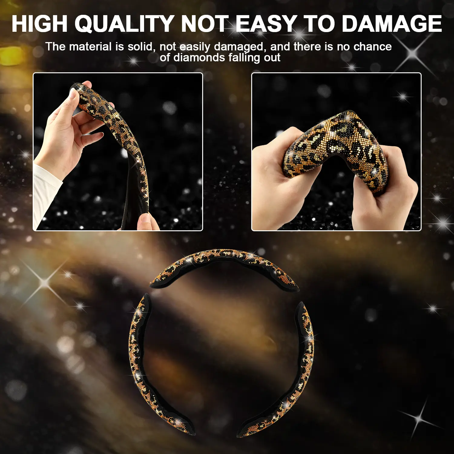 The best steering wheel cover!!! i didn’t know how it was supposed to stick with no glue but it fits just right after you push it onto the wheel, really snug doesn’t slip when i turn or anything, it doesn’t “hurt” your hands it’s just rhinestones so don’t grip them that hard lol and they stay on!