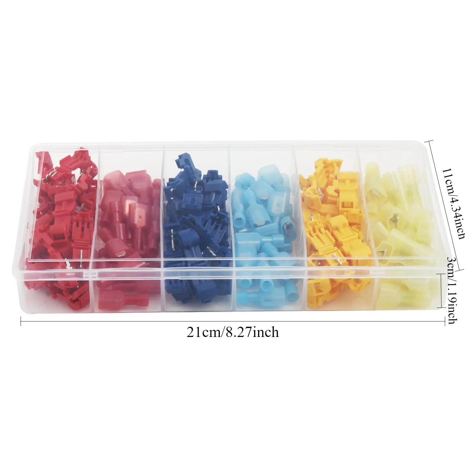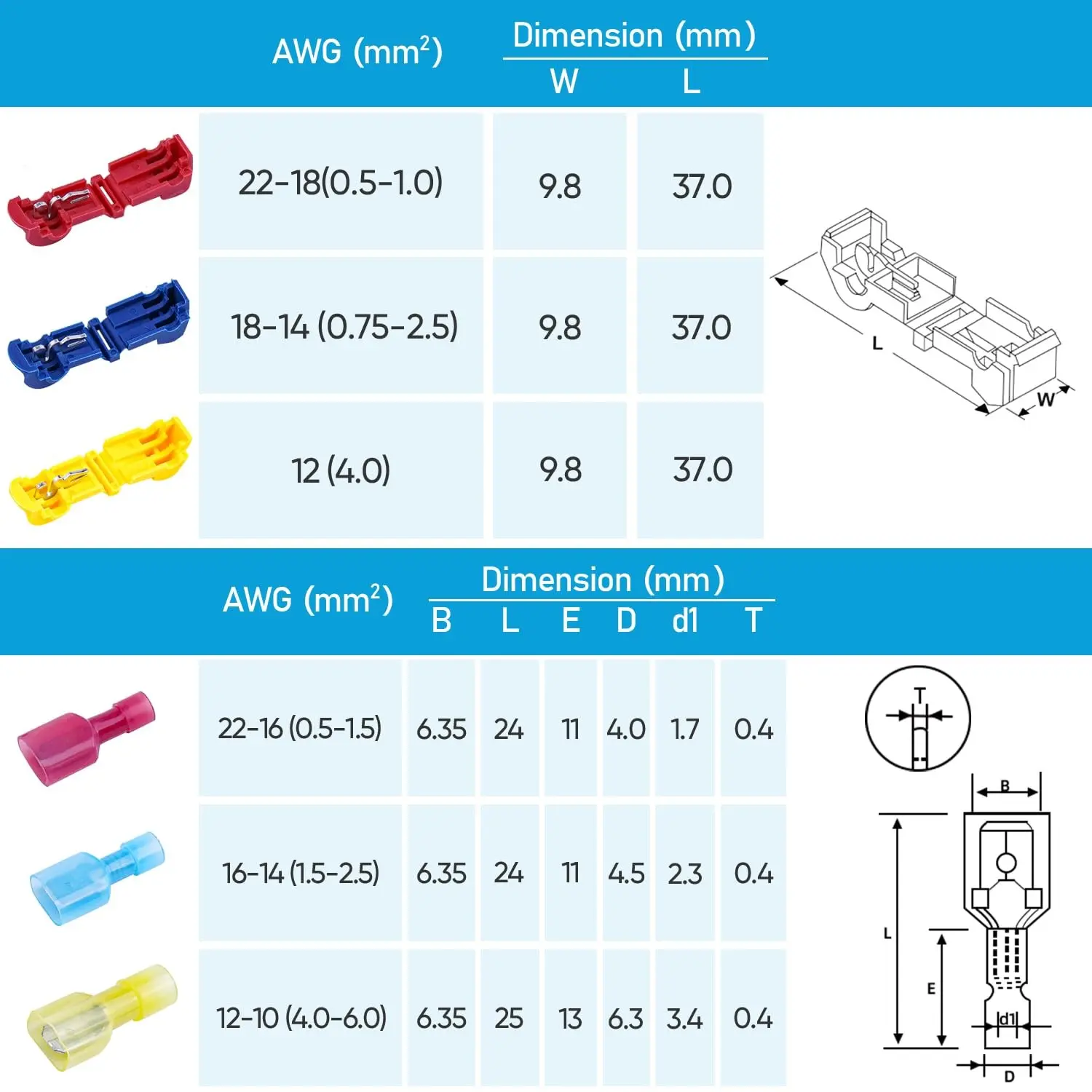 【WIDE APPLICATIONS】The T-Tap Wire Connectors and Male Quick Disconnects will last for numerous wiring projects. Marine, automotive, scientific, home wiring projects - you name it. The connector assortment includes red (AWG 22 – 16), blue (AWG 16 – 14) and yellow (AWG 12 – 10) T-TAP connectors that can be used on wire AWG from 22 to 12.
