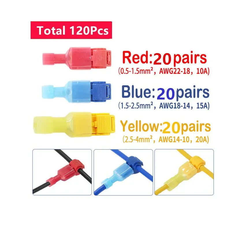 Quick Cable Connector, 120pcs Snap Lock Wire Terminal Crimp T-Tap Connector Kit, Fast Electrical Fix, Prevent Loose Wires, No-Strip Design, Ideal for DIY Home Improvement, Auto Wiring, Car Stereo, Motorcycle, Boat, RV Repair, Durable