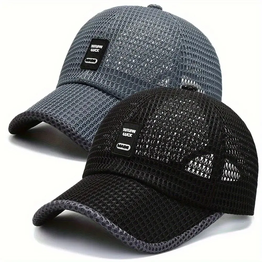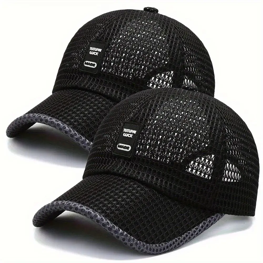 2pcs Quick-Dry Polyester Baseball Caps - Breathable Mesh Adjustable Unisex Summer Sun Hats with Black & Gray Textured Design for Outdoor Sports & Casual Wear, Breathable Mesh Construction