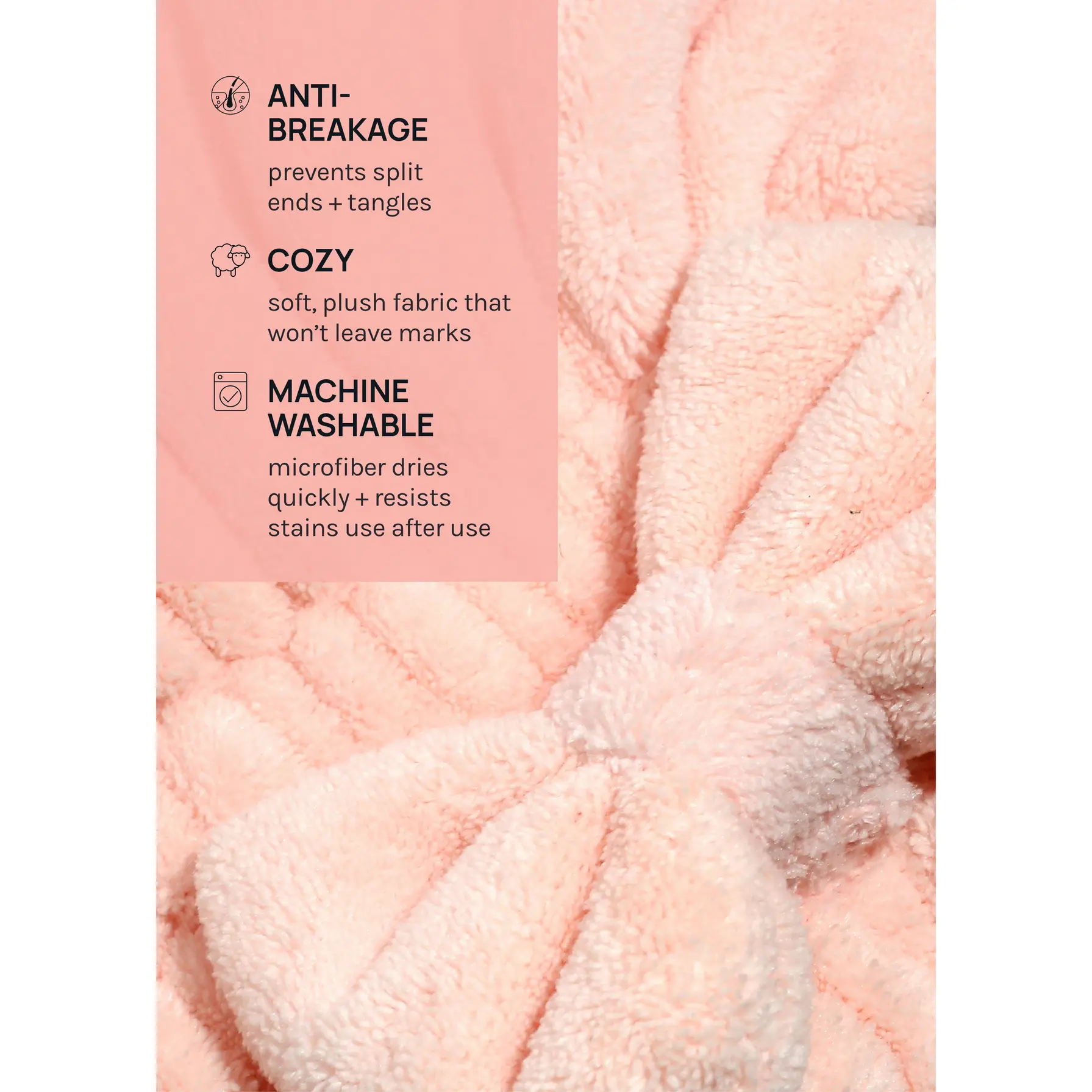 I love it! Keeps my head warm too. Made of terry cloth. Designed so cute! Helps dry hair quicker it’s light not bulky!