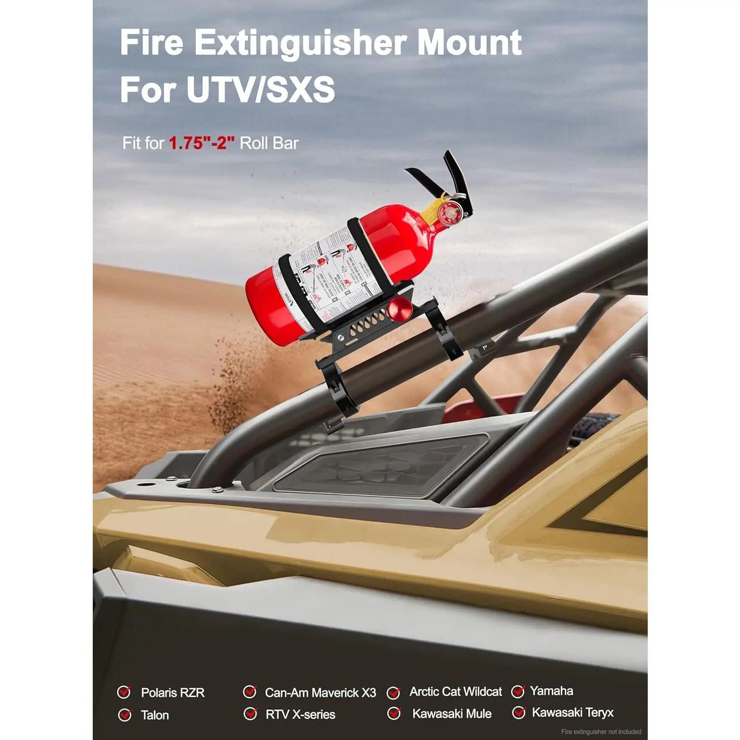 [Fits like a glove]UTV fire extinguisher bracket fits 1.75"-2" roll cage, compatible with Polaris RZR, Cam am x3, Kawasaki tervx, Honda, Yamaha, CFMOTO, Jeep Wrangler JK/JL/JLU/JT, car or marine boat,any vehicle with 1.75"-2" roll bar, fire extinguisher mount for vehicle is the ultimate add-on for any off-road enthusiast