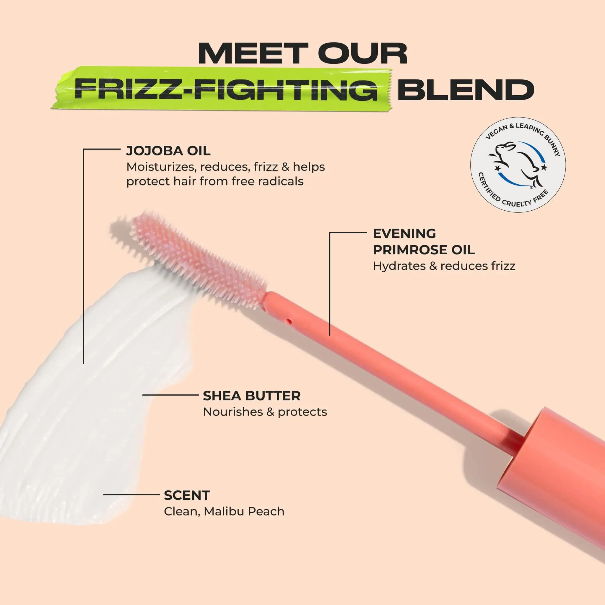 ·Grounds flyaways, smooths baby hairs, sculpts hairlines and fights frizz