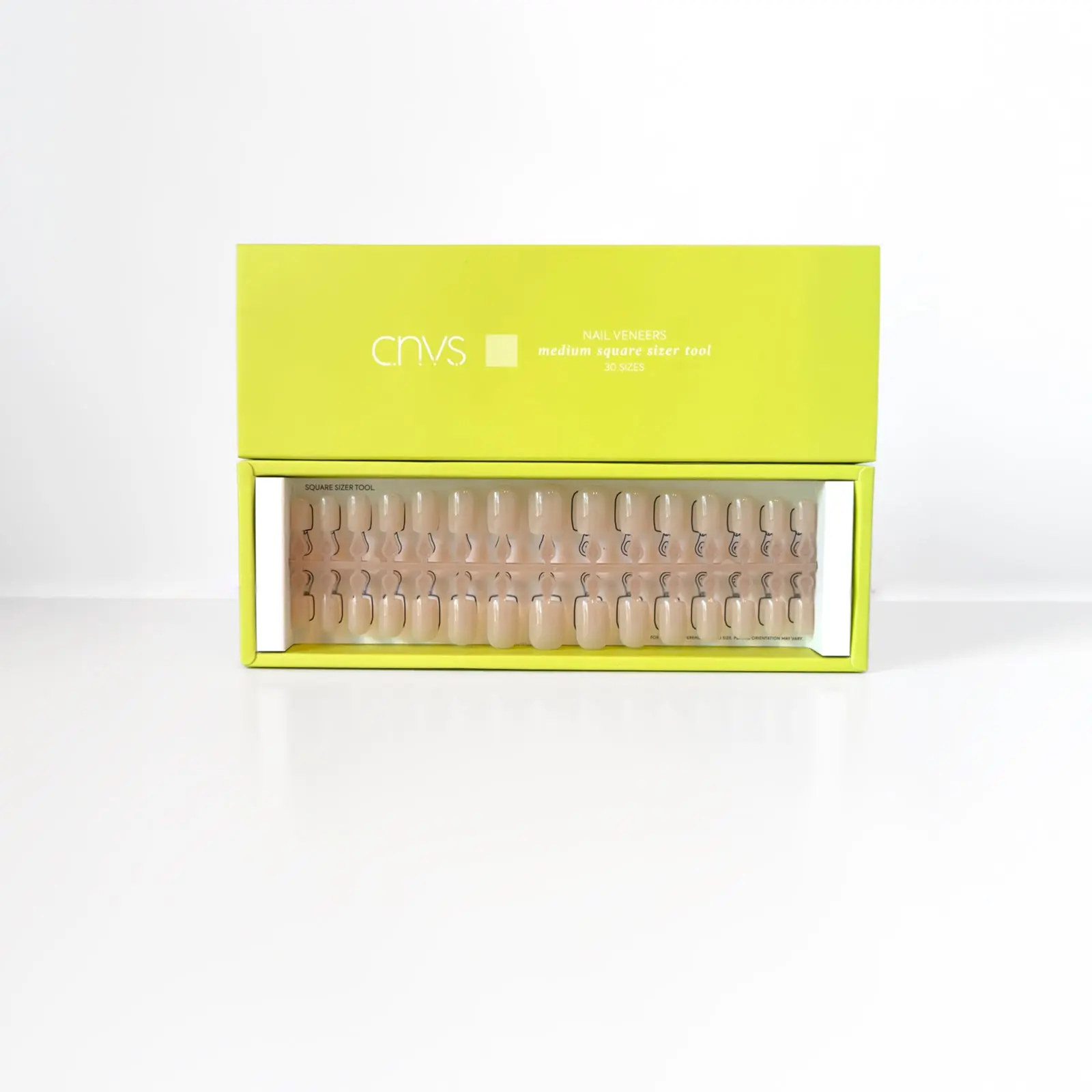 Get COLORCURE Putty and a (2-pack) Medium Square Sizer Tools. Pre-colored nail veneers ensure a flawless finish. Cure for 30 seconds, then add 60 seconds for longevity.