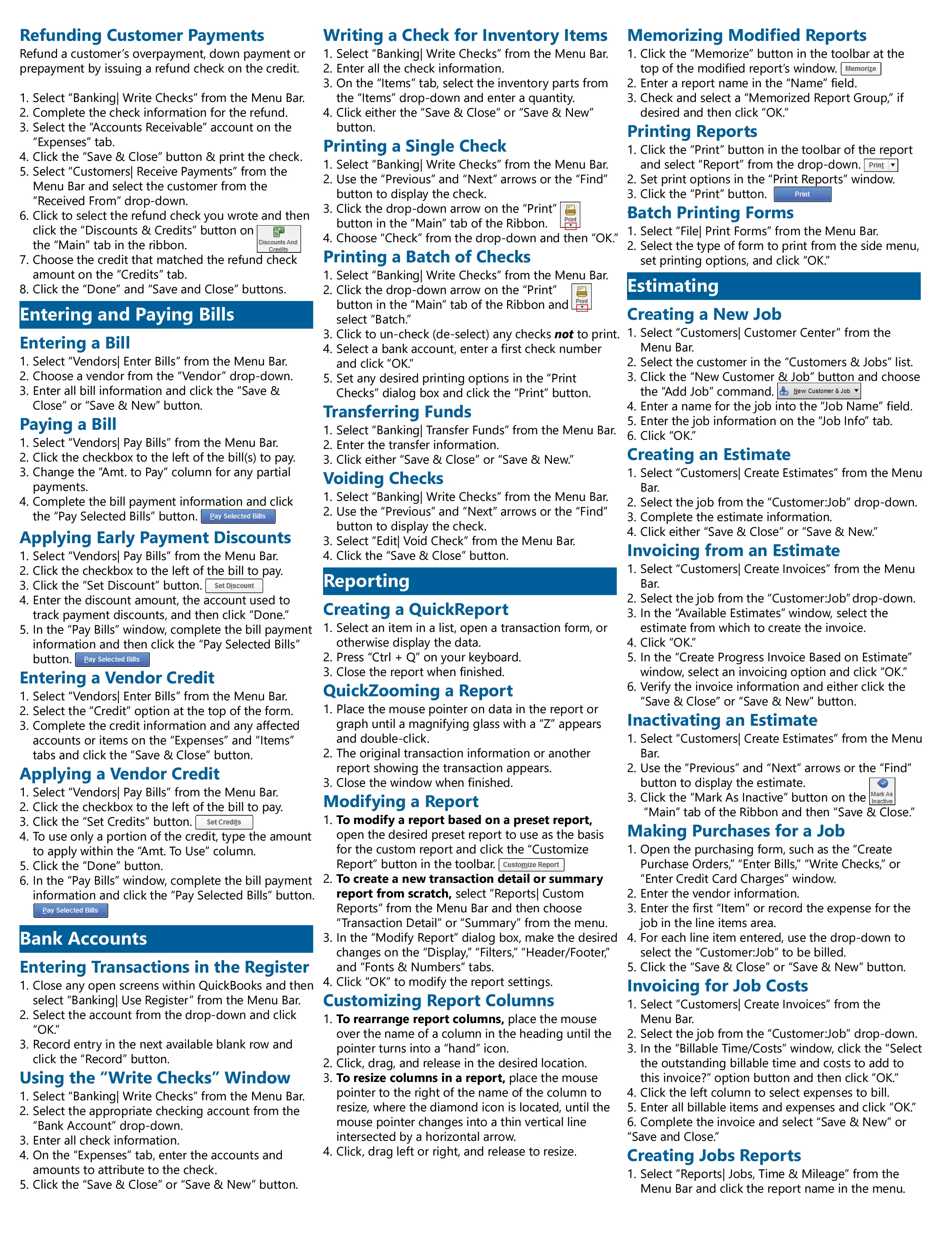 Designed with the busy professional in mind, this 4-page quick reference guide provides step-by-step instructions in QuickBooks Pro 2014. When you need an answer fast, you will find it right at your fingertips. Clear and easy-to-use, quick reference cards are perfect for individuals, businesses and as supplemental training materials.