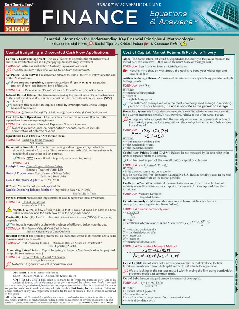 Students and business owners alike are sure to find that this 3-panel (6-page) guide is an invaluable source of comprehensive, up-to-date information regarding key financial principles and methodologies, as well as the formulas and equations that apply to them. Easy-to-use icons help users go right to the equations and formulas they need to learn, and call out helpful tips to use, common pitfalls to avoid, and critical points to remember.