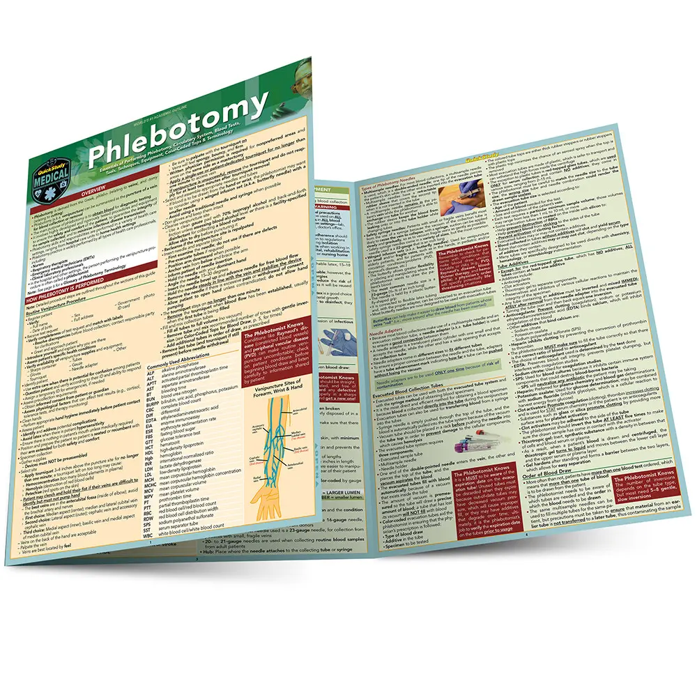 Our best-selling comprehensive 6 page laminated guide is the perfect resource to help phlebotomy (venipuncture) students understand those procedures that enable blood draw/testing to be safe and comfortable for patients. Different forms of testing, equipment and other aspects of phlebotomy are explored in detail. Includes easy-to-read tables and diagrams. Each section features “The Phlebotomist Knows” summary of critical points, set off graphically for easy reference. As customers have said this guide has "everything you need to know for phlebotomy.