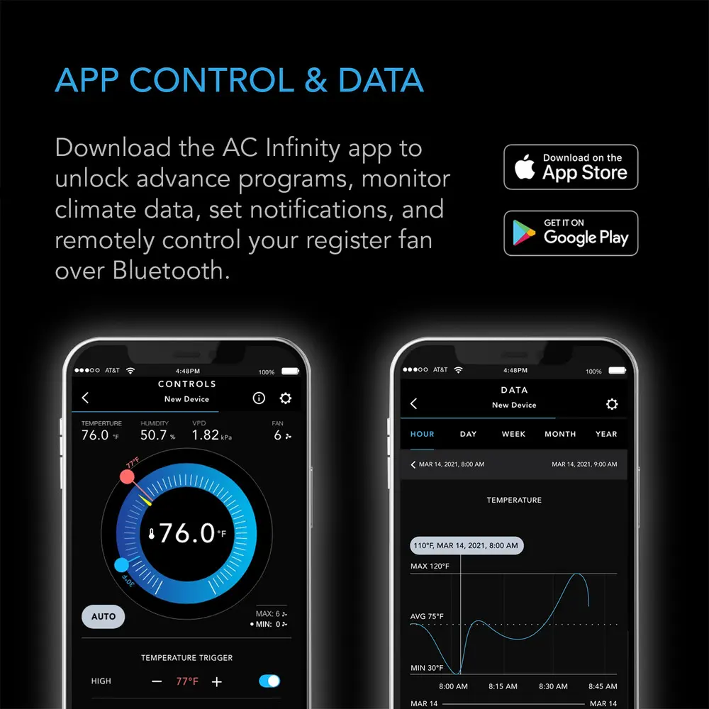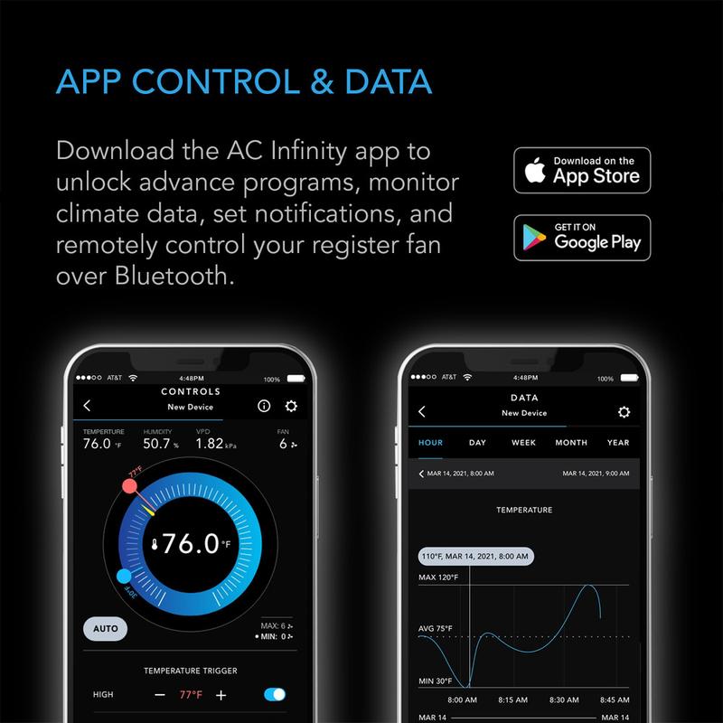 The onboard controller features active thermal monitoring, using temperature triggers to activate this register fan in response to crossing heating or cooling thresholds. Minimum baseline levels keep the register fan running at low speeds for consistent airflow, while timer and cycle modes add custom on-demand activation. Securely connect to the AC Infinity app via Bluetooth to utilize automation capabilities from anywhere throughout the day. Remotely access your devices, unlock advance programs, set alarms and notifications, view historical charts, and export CSV data.