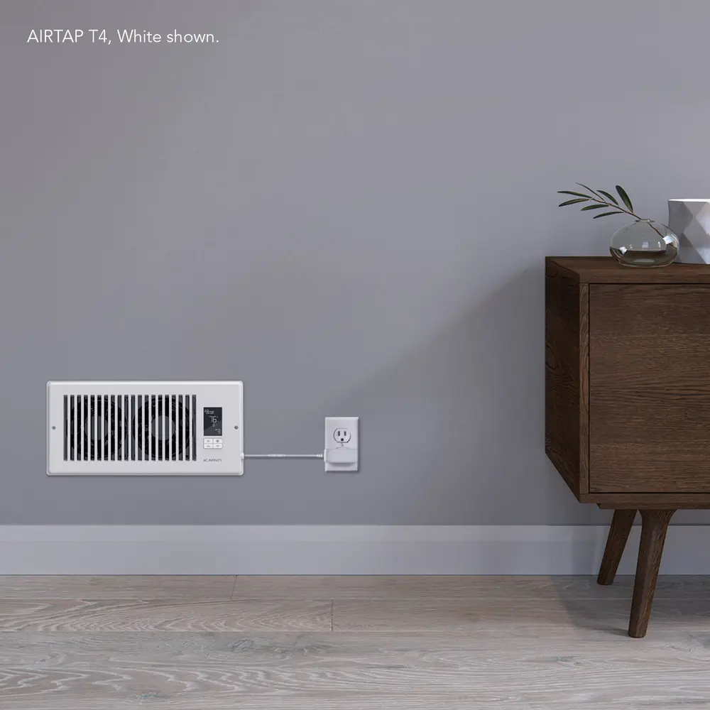A quiet register fan system designed to improve airflow coming from your central AC or heating system. With this fan, you can boost the amount of cool or warm air exhausted from registers where airflow is traditionally weak. This will improve your rooms' comfort level while reducing energy costs. It features an onboard smart controller programmed with cooling and heating triggers, timer and cycle programming, and 10-level speeds. You can access these controls and more remotely by connecting to the AC Infinity app using Bluetooth. The register booster fan is finished with a premium aluminum front plate with CNC-machined detailing that gives a clean aesthetic to your register.