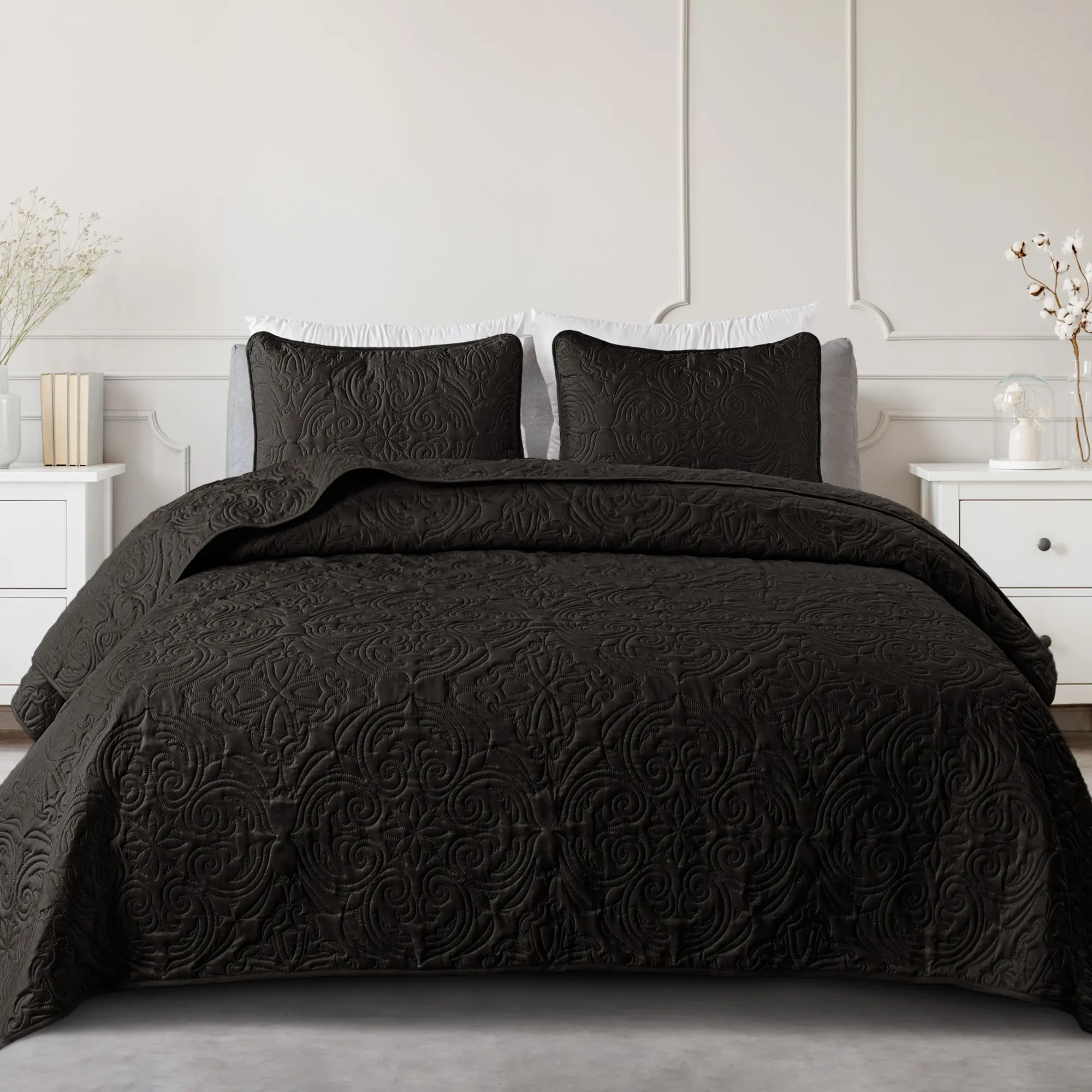 For the price, I love this quilt set. It’s the size king in birch beige and it is on a king size sleigh bed. The length on both sides is perfect. It’s also nice to sleep under. Very comfortable. I would buy it again.